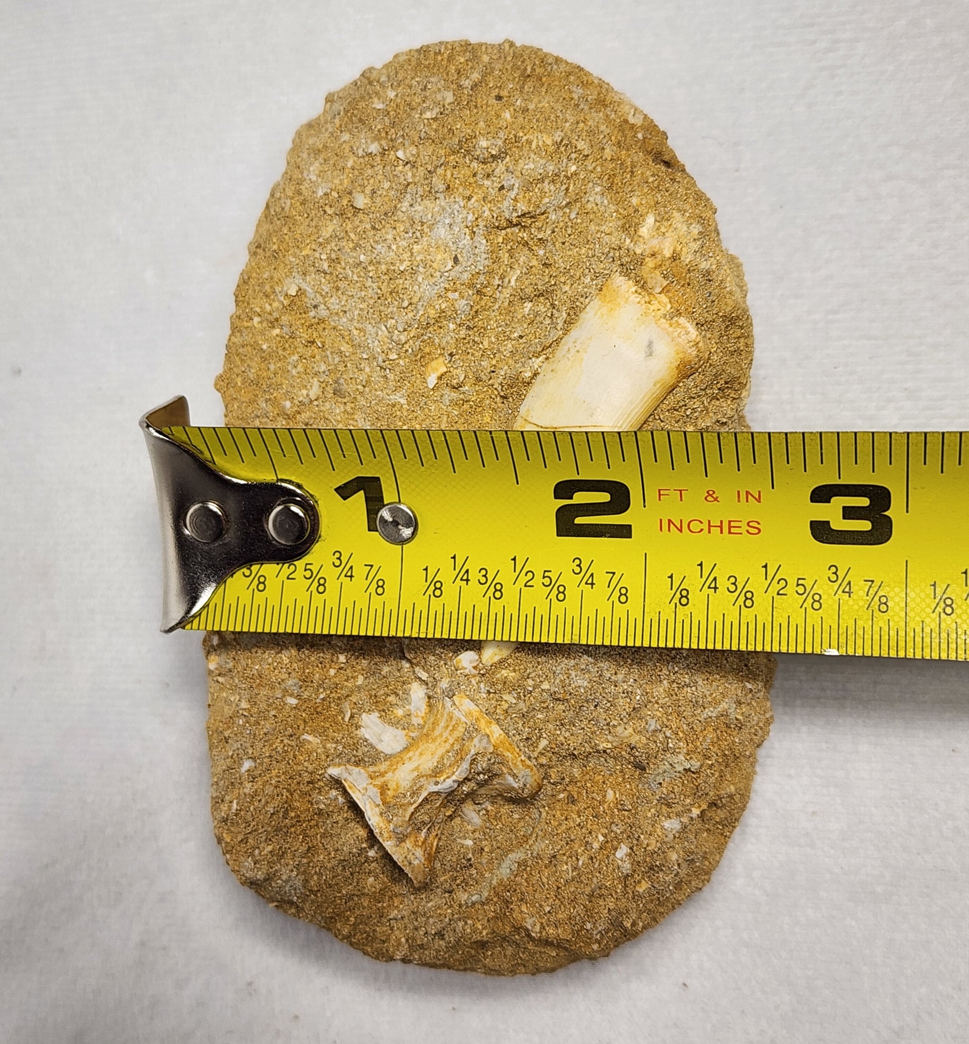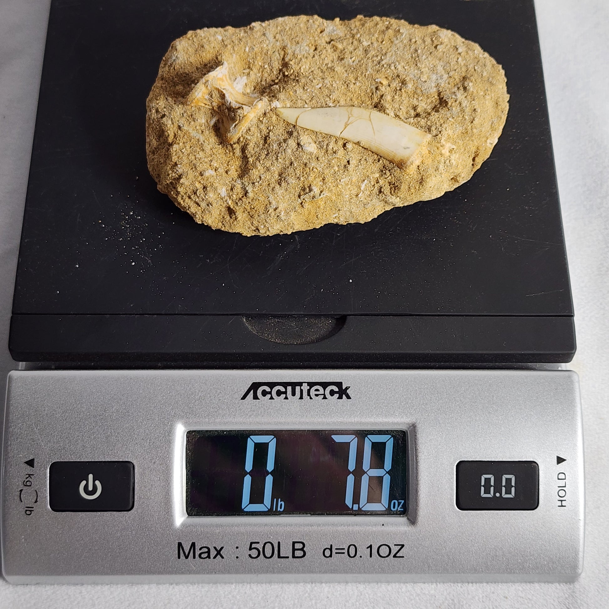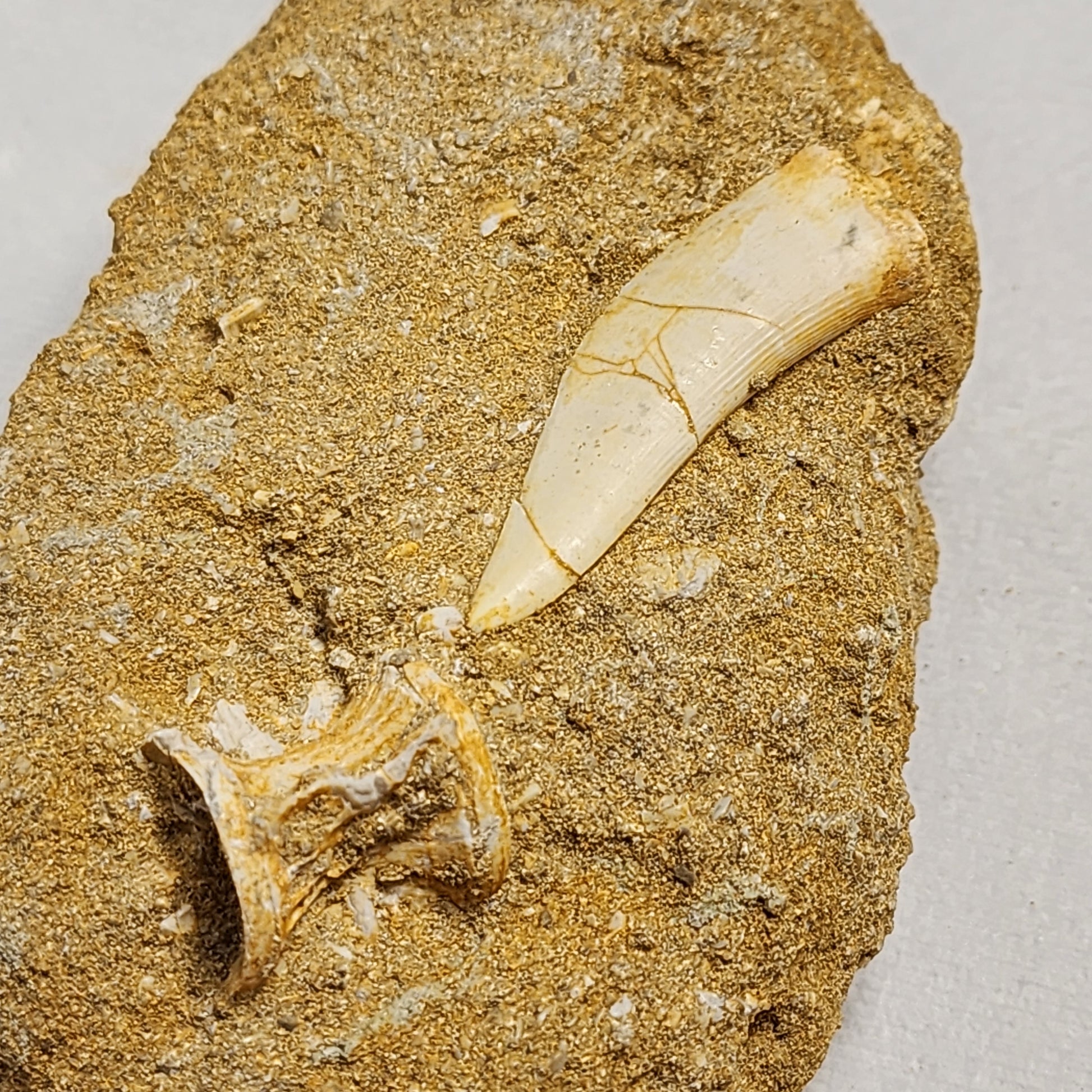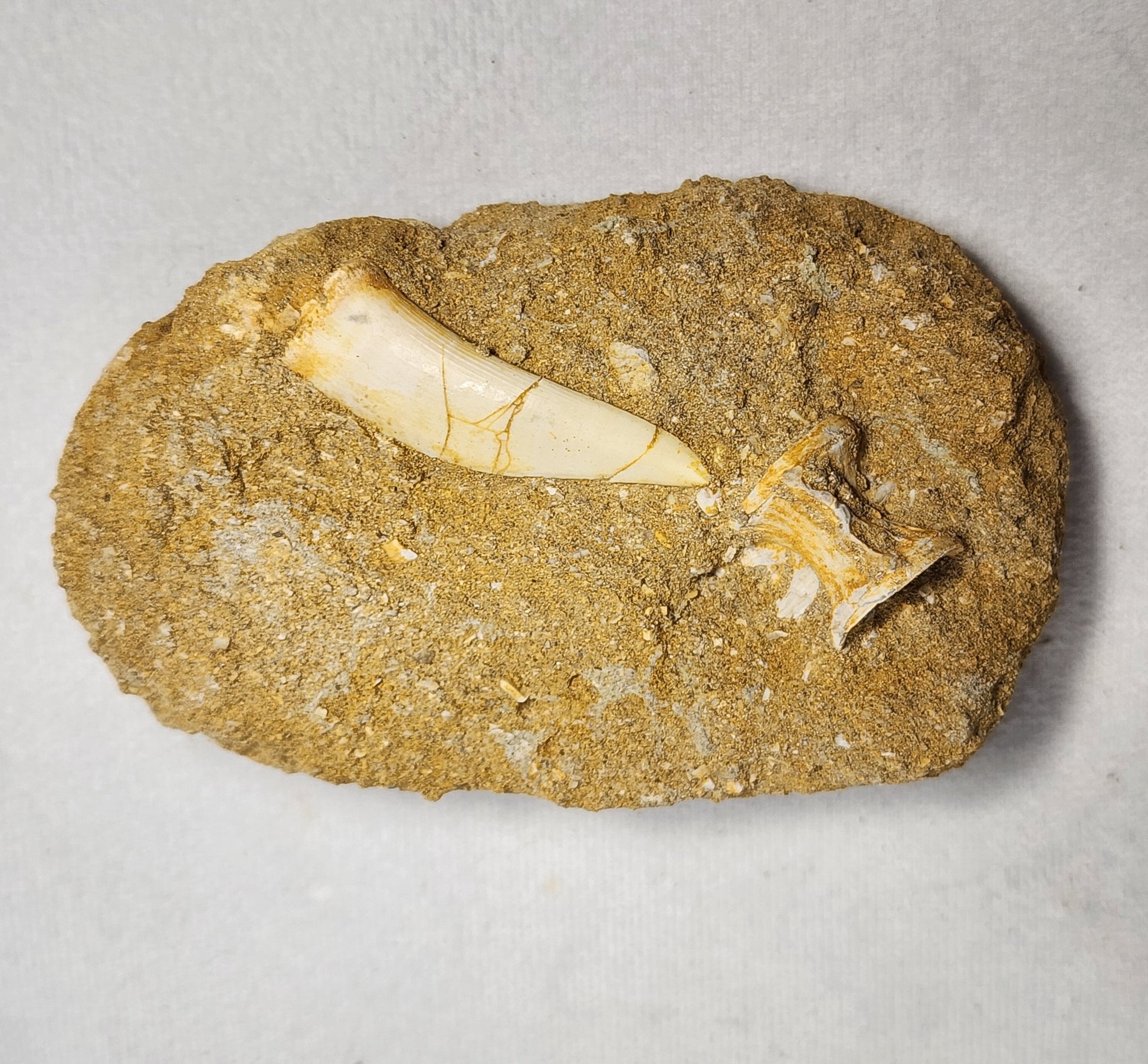 This matrix is from Morocco and you can see some amazing fossil finds in it! The Plesiosaur tooth is very evident and you can see the fish vertebrae peaking through!