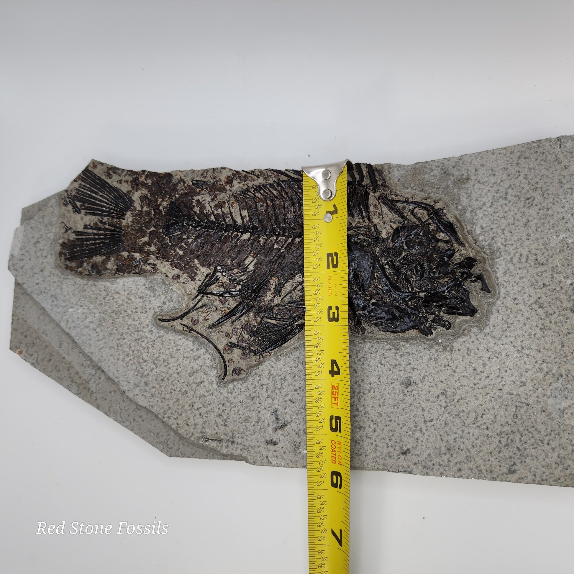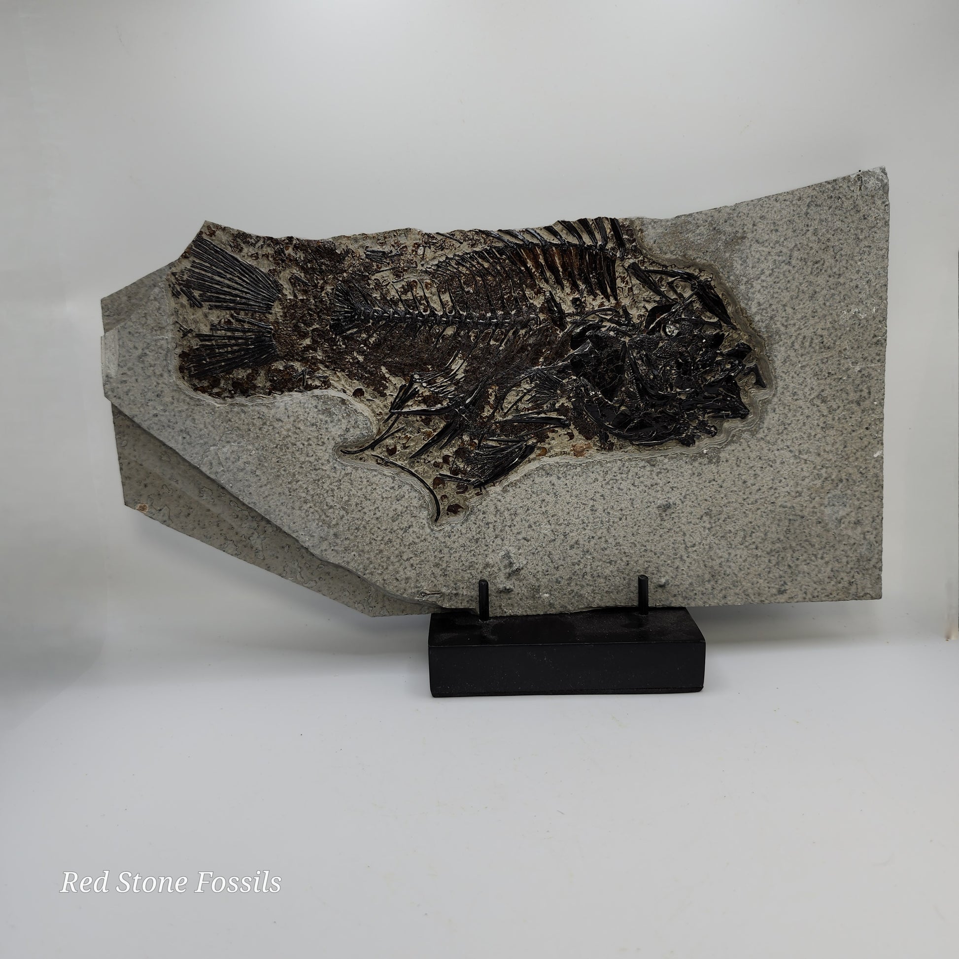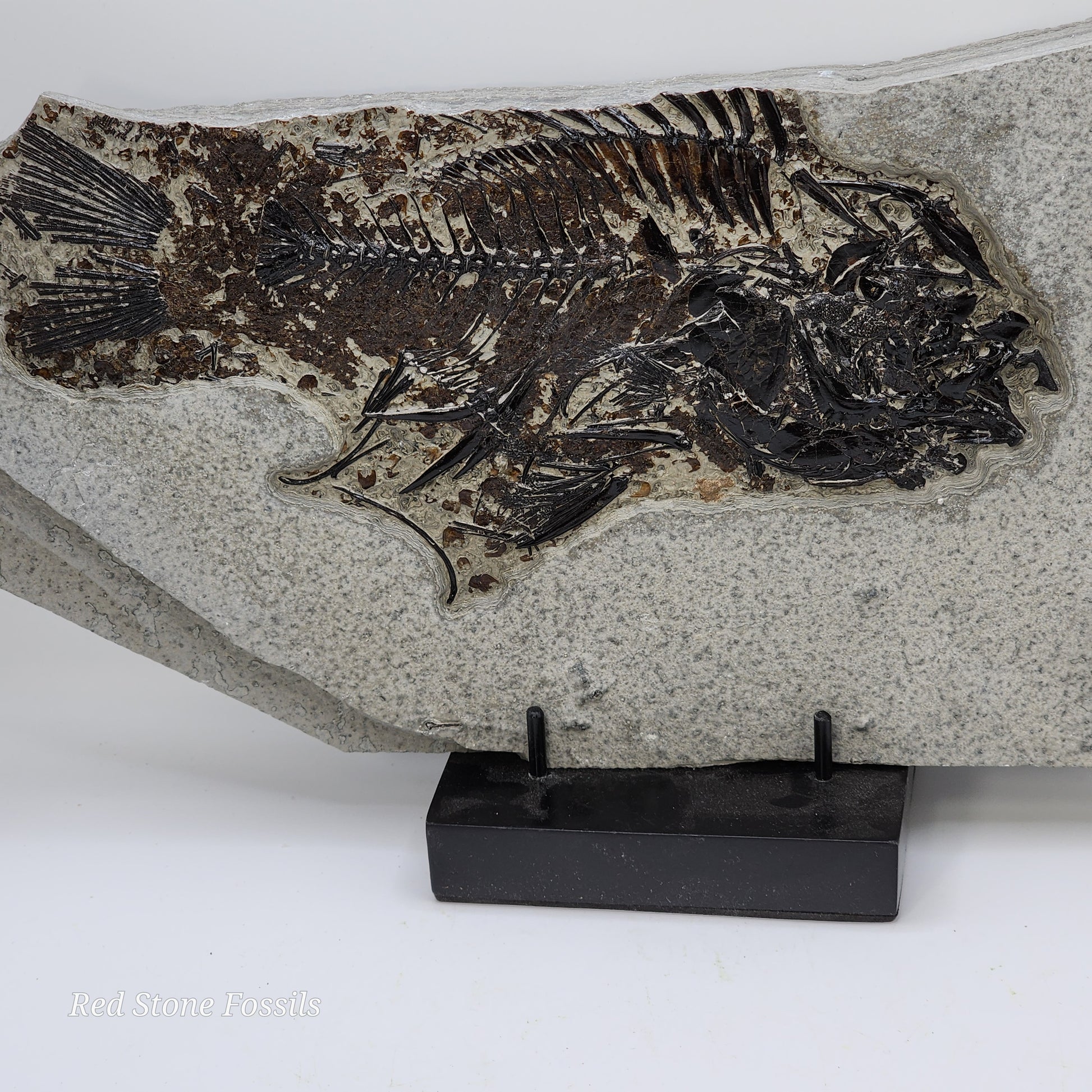 Look at this beautiful and detailed Priscacara Serrata from Green River Wyoming. Its time in its matrix has caused an explosion of fossil and scales yielding the gorgeous piece you see here. Unfortunately, upon extraction its top fins were lost. Even still, the recovered specimen has retained most all of its detail and thick fossilized bone. This piece has an eye catching deep black color and still holds the shape it held in life. Pair with our Septarian spheres for an amazing fossil display.