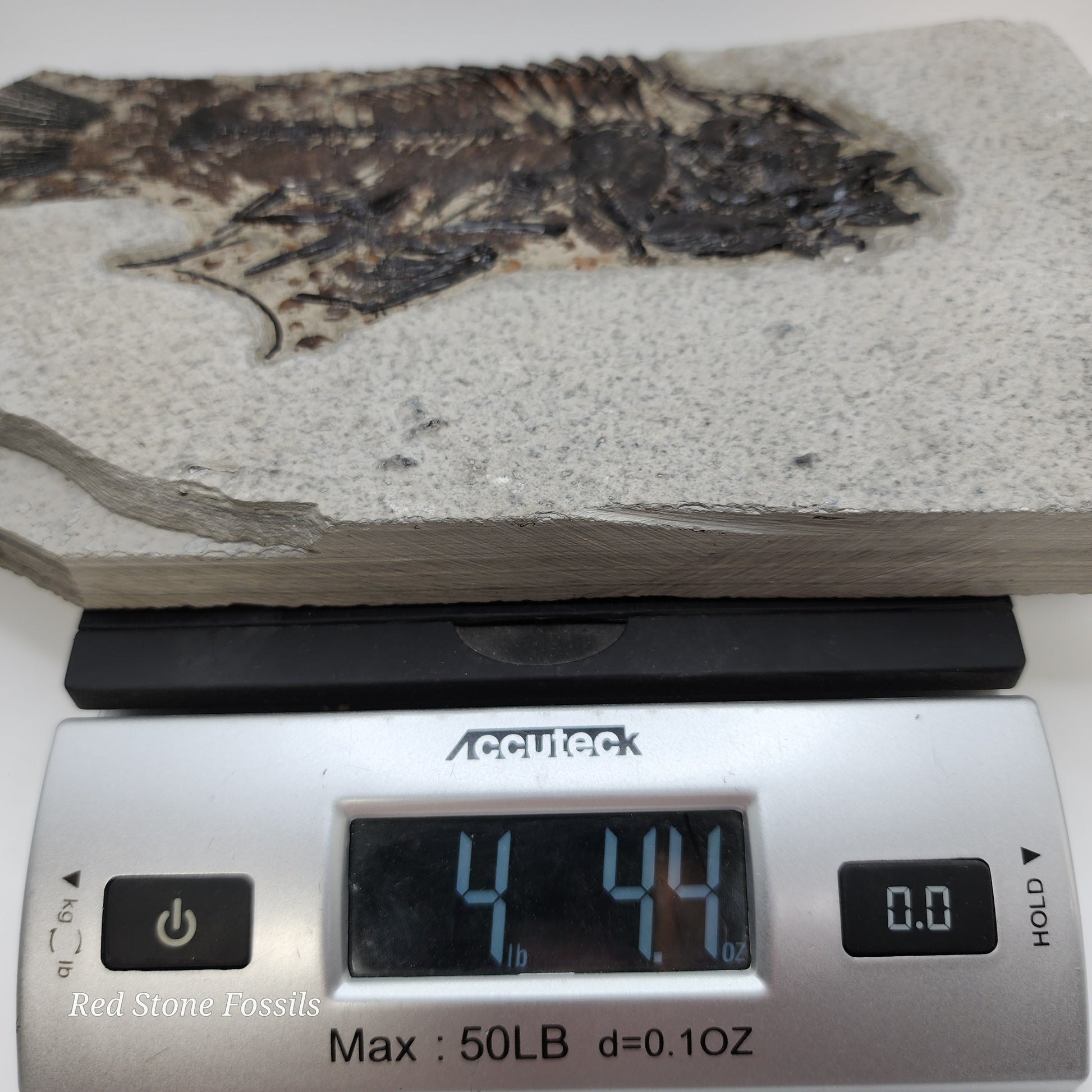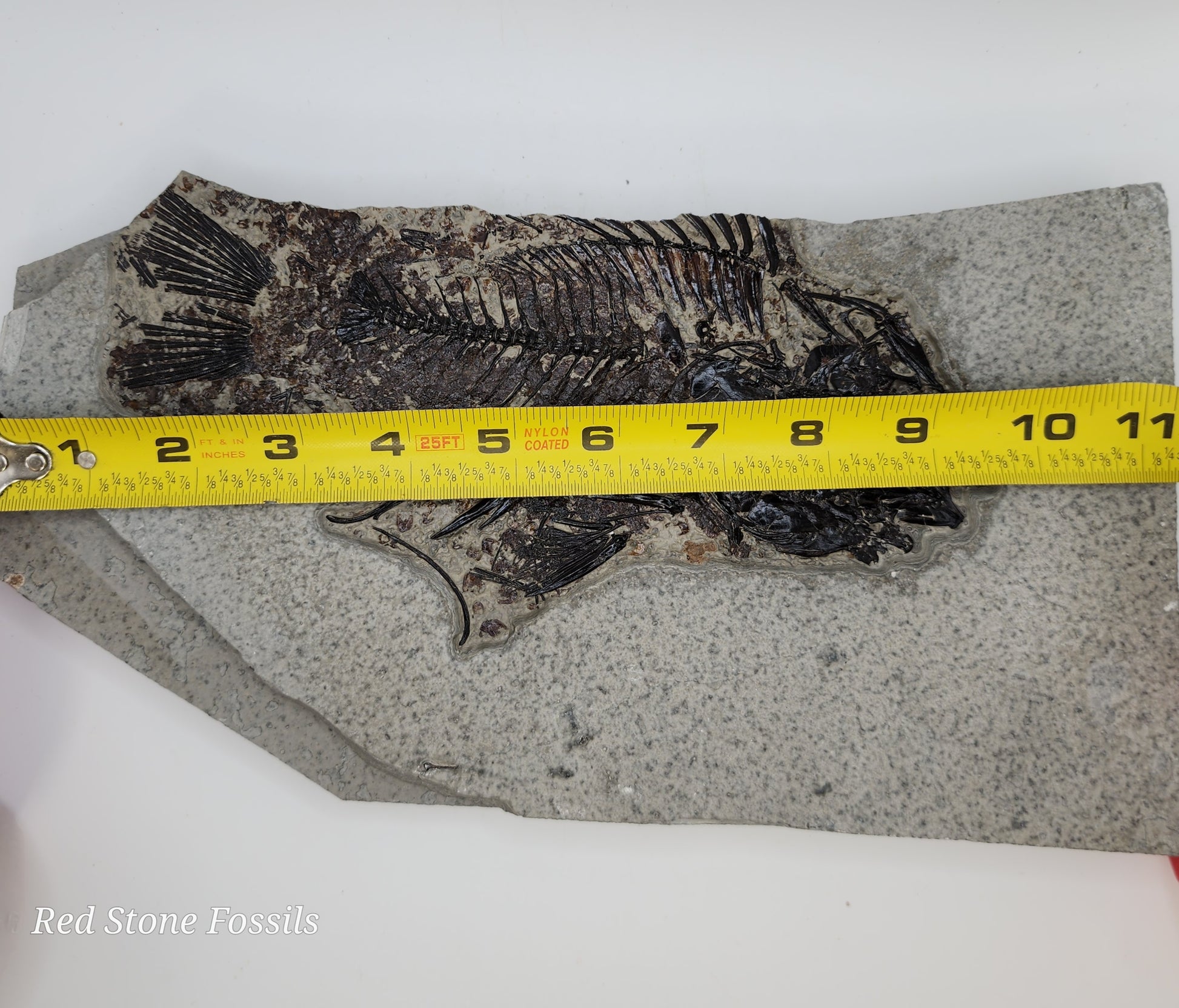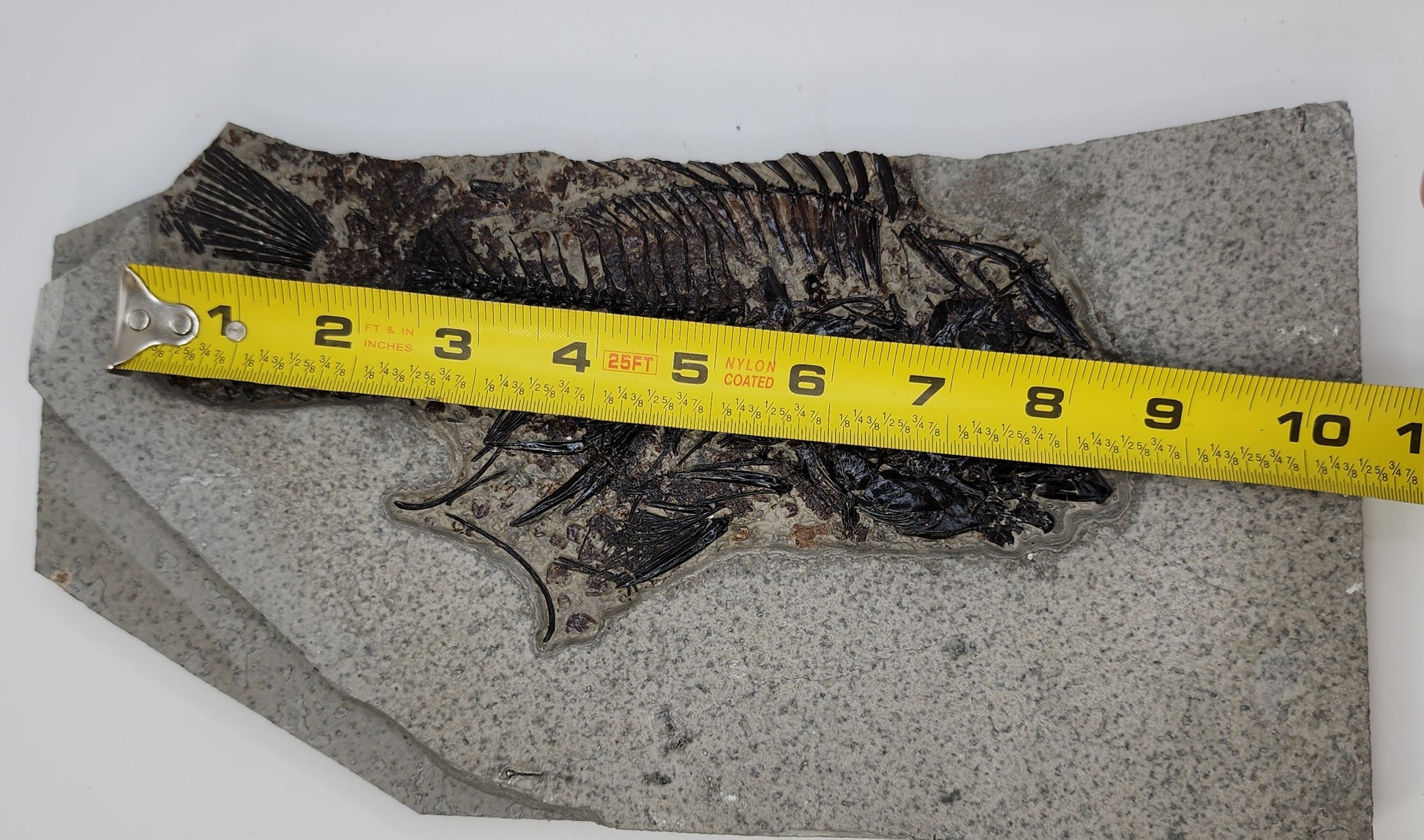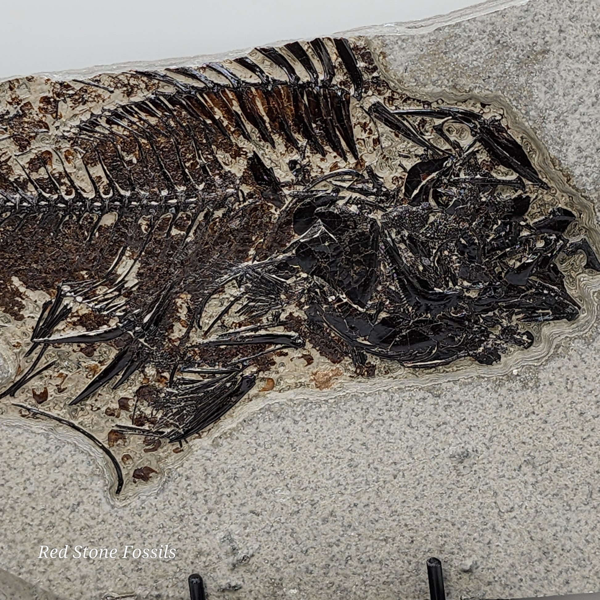 Look at this beautiful and detailed Priscacara Serrata from Green River Wyoming. Its time in its matrix has caused an explosion of fossil and scales yielding the gorgeous piece you see here. Unfortunately, upon extraction its top fins were lost. Even still, the recovered specimen has retained most all of its detail and thick fossilized bone. This piece has an eye catching deep black color and still holds the shape it held in life. Pair with our Septarian spheres for an amazing fossil display.
