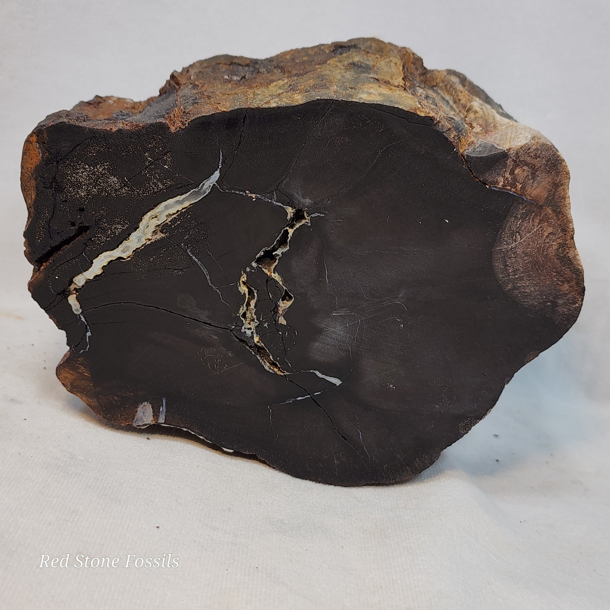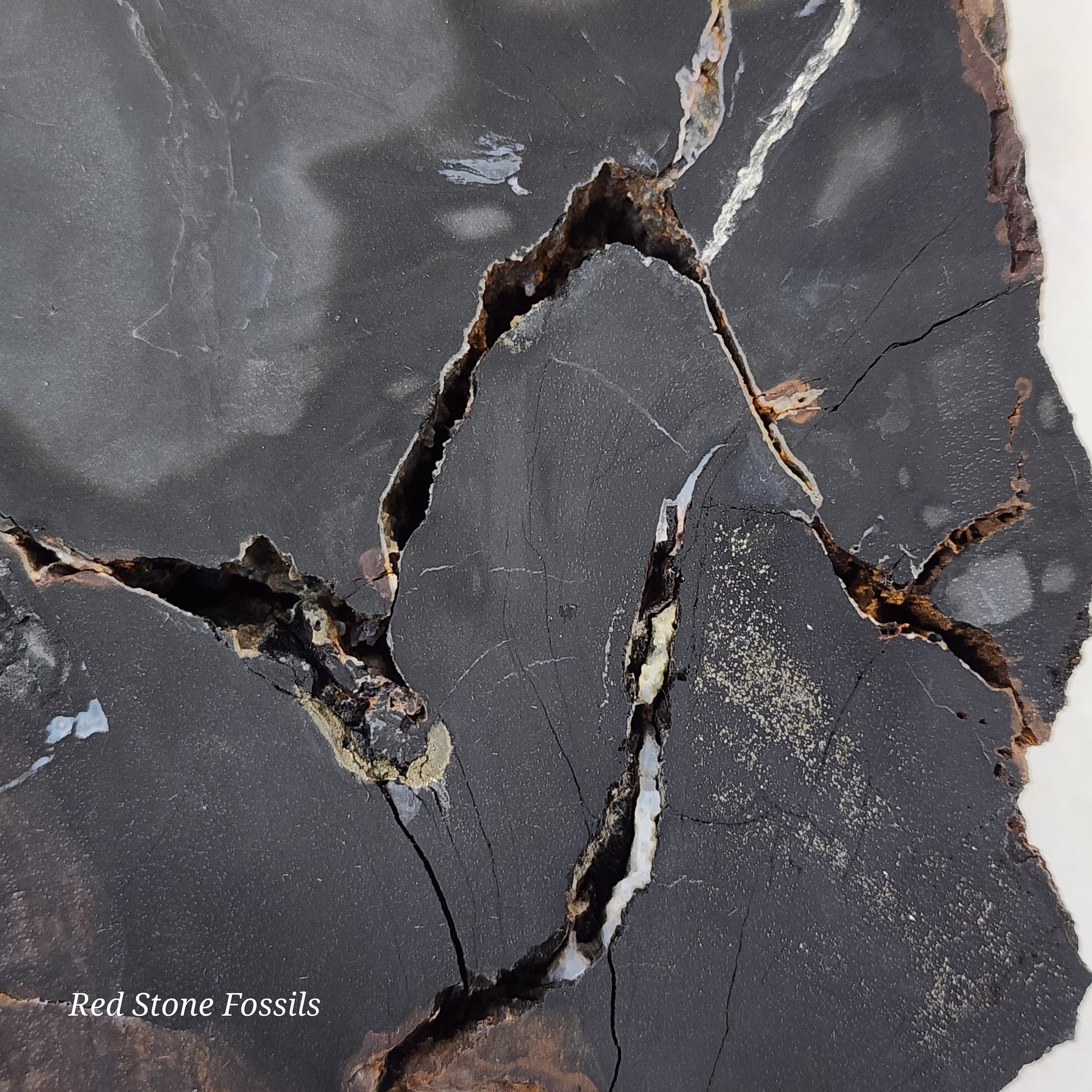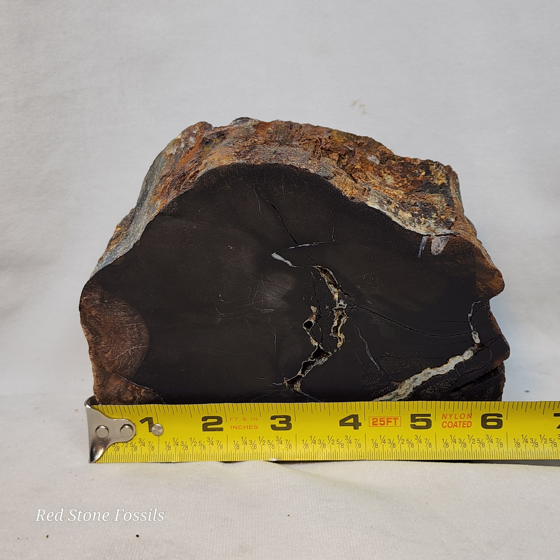 This specific specimen has been polished on each side, but the exterior has been left in its natural state. The gorgeous slab has cracks and crevices that have amazing mineral pockets and the natural exterior is a beautiful deep brown!