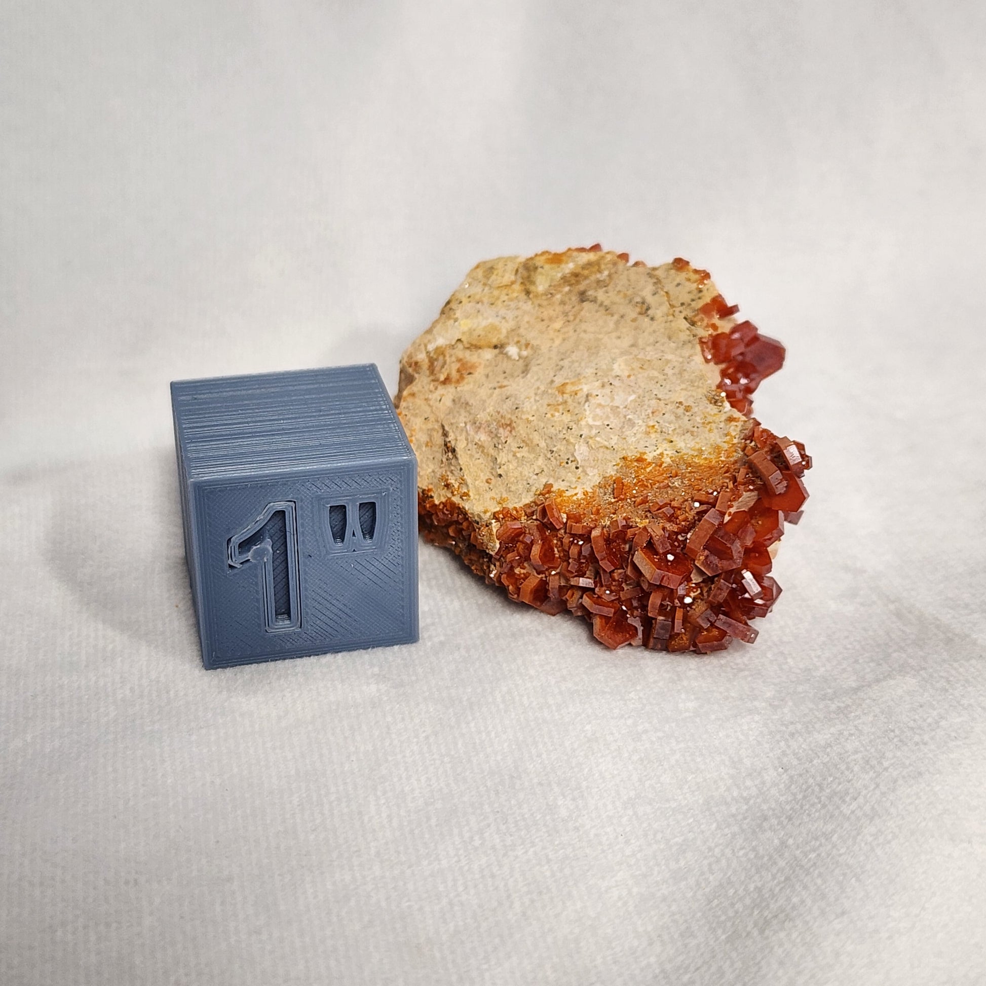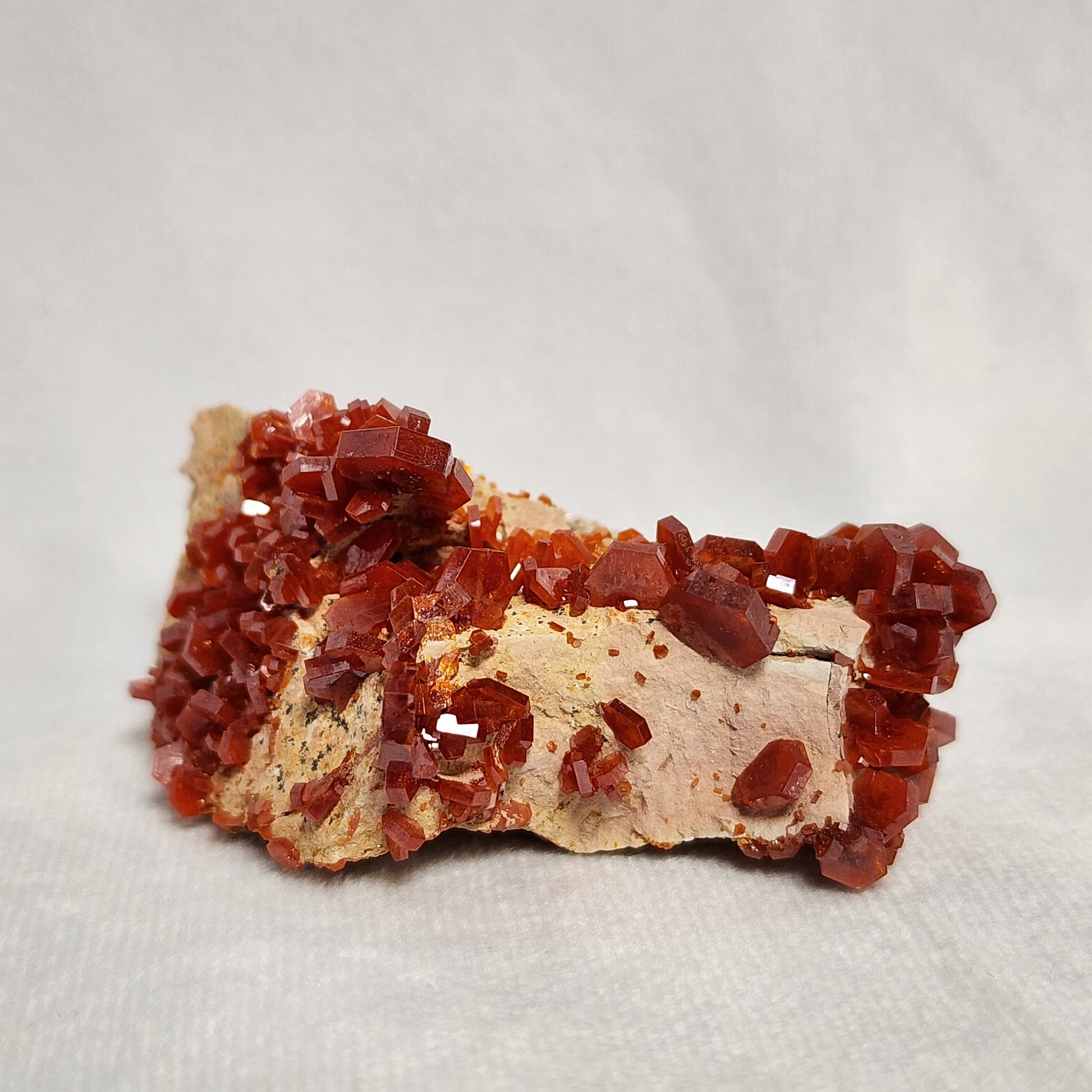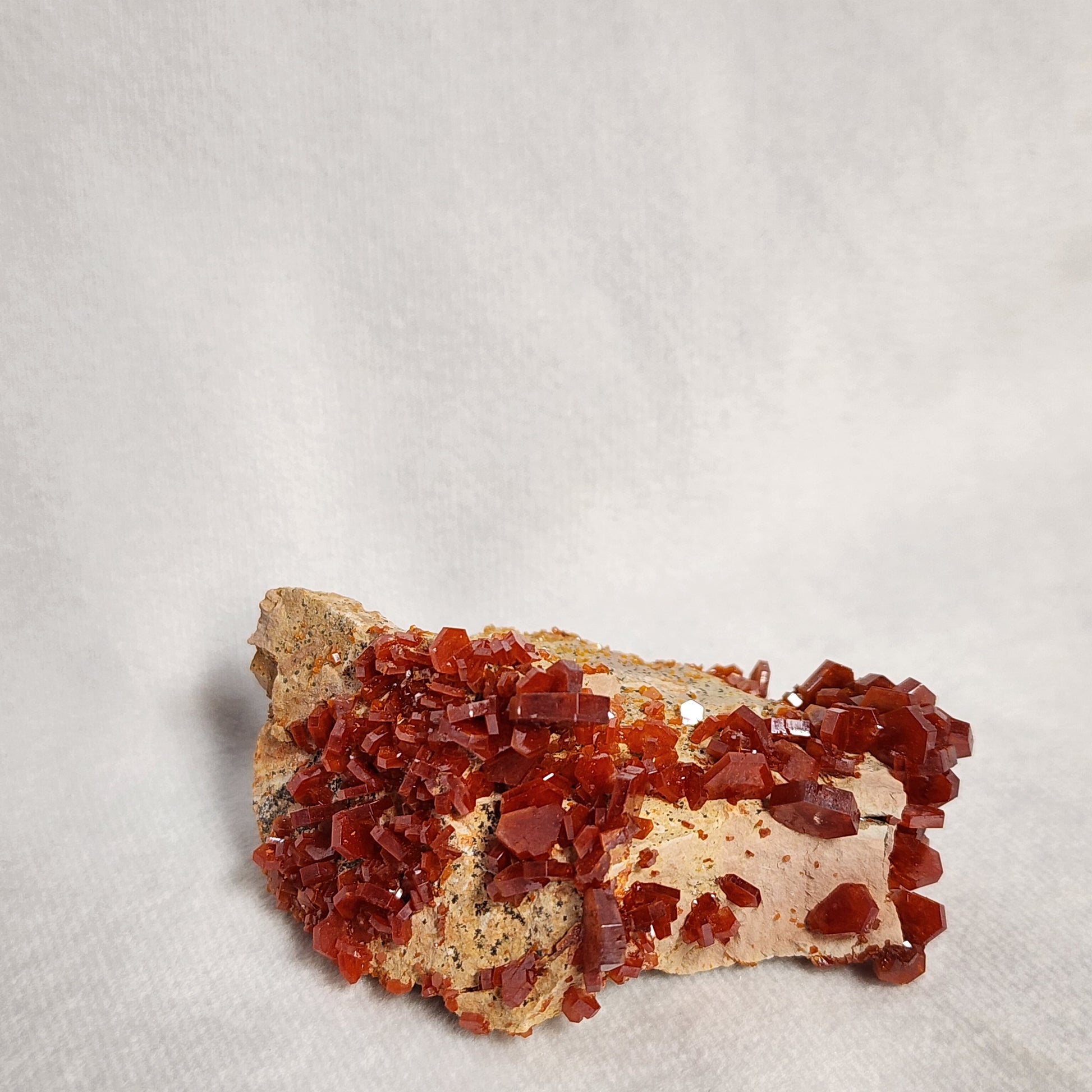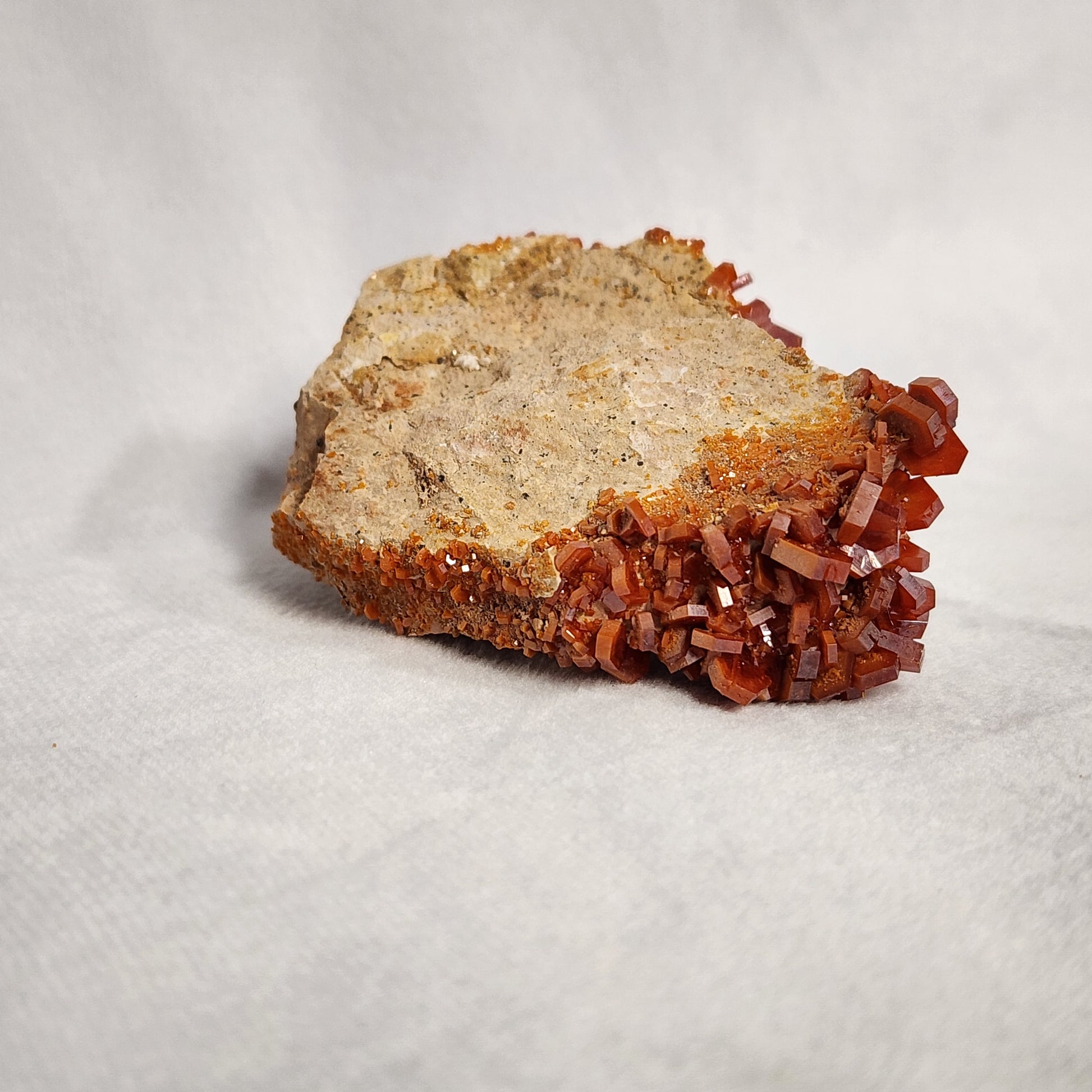 Vanadinite is a mineral known for its beautiful red-orange hexagon shaped crystals. This specimen is from Morocco and has several large, visible crystals on it along with some smaller crystals that wrap the matrix.