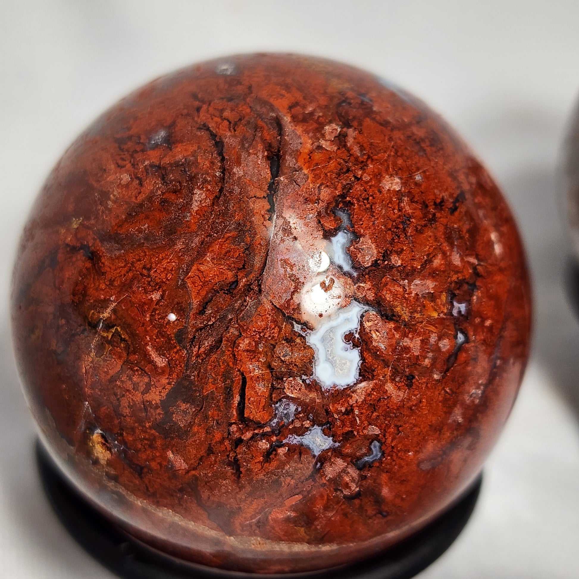 Unique Agate Sphere. This specimen is a spectacular shade of red with some brown and black swirled in. This sphere just captures the eye and adds an elegant look to any room!