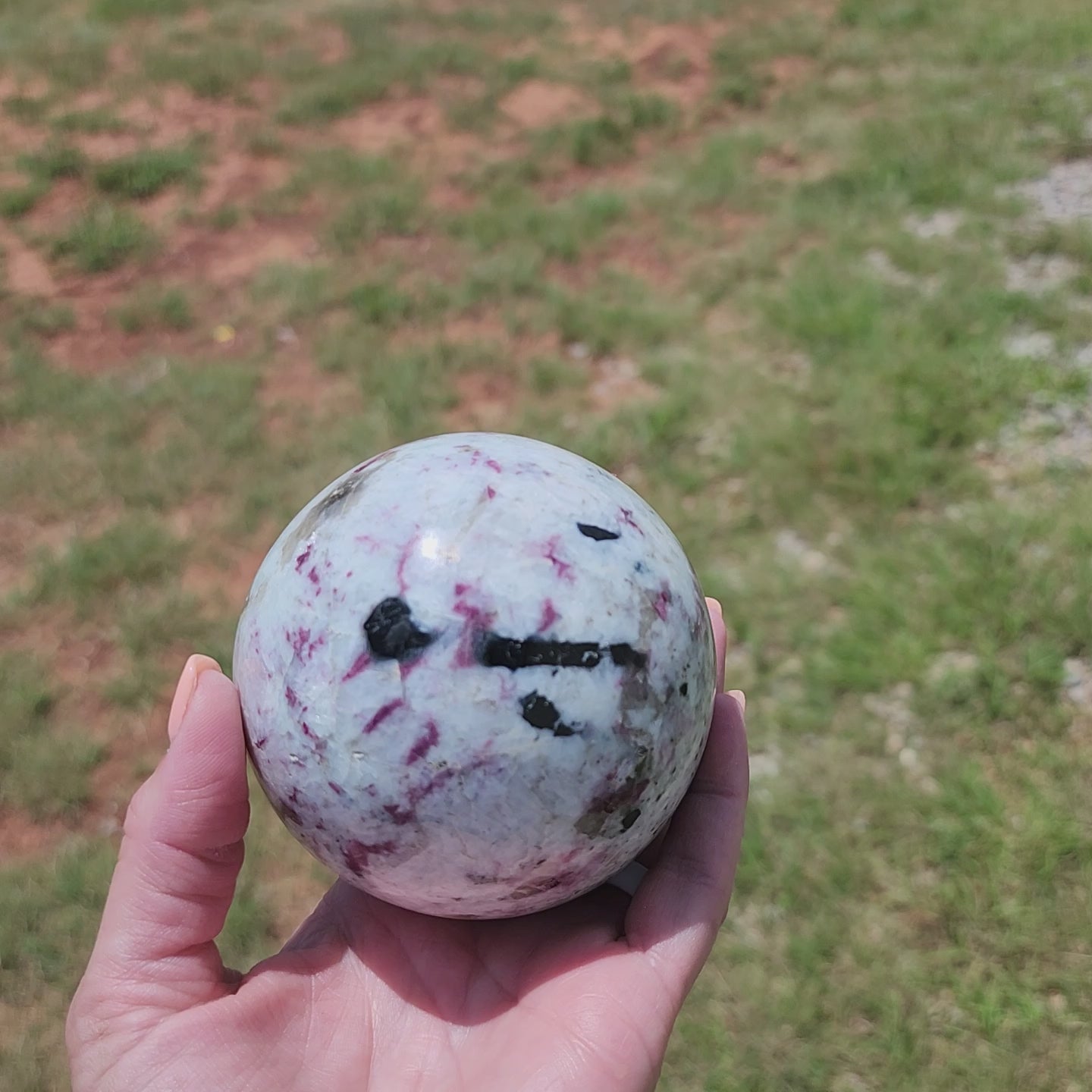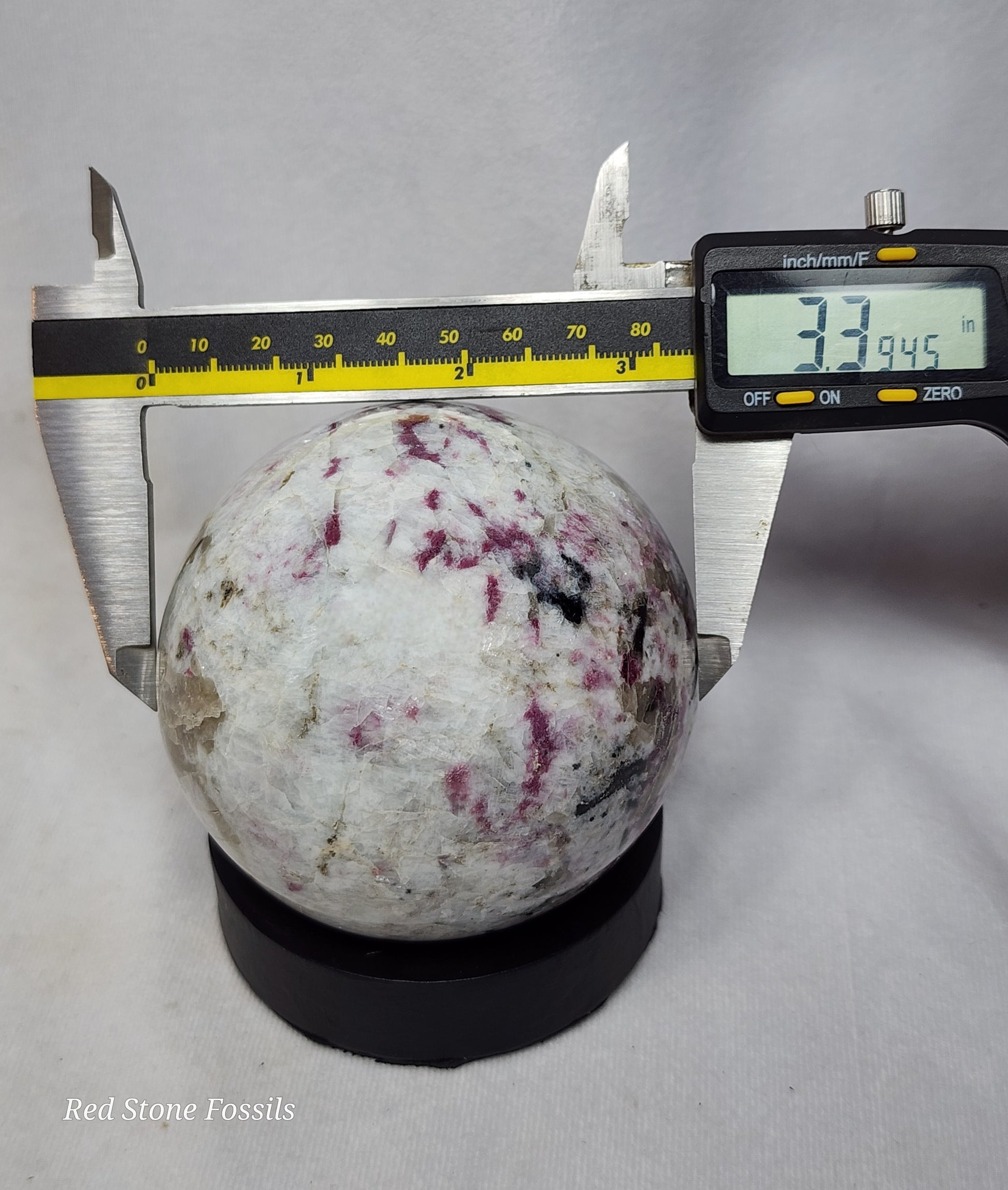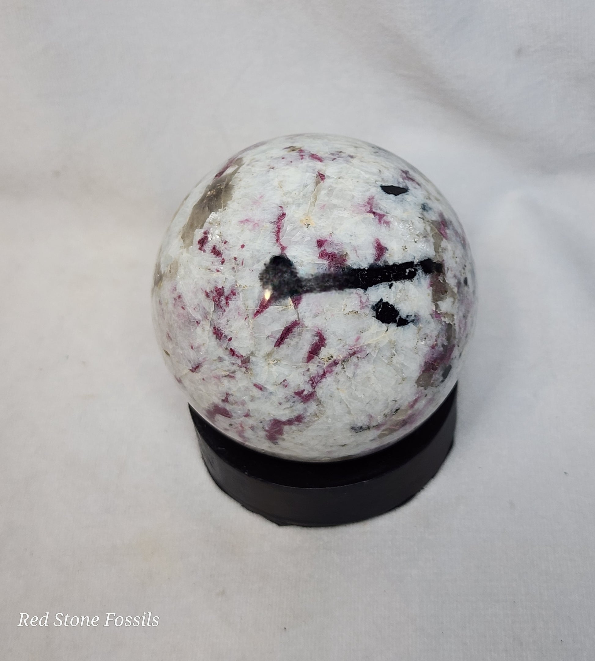 Rubellite is a remarkable pink to red variety of tourmaline. This sphere has beautiful speckles of Pink and Black Tourmaline surrounding it. This piece is perfect for the entry way or living room, a place to show off its natural beauty and stunning features!