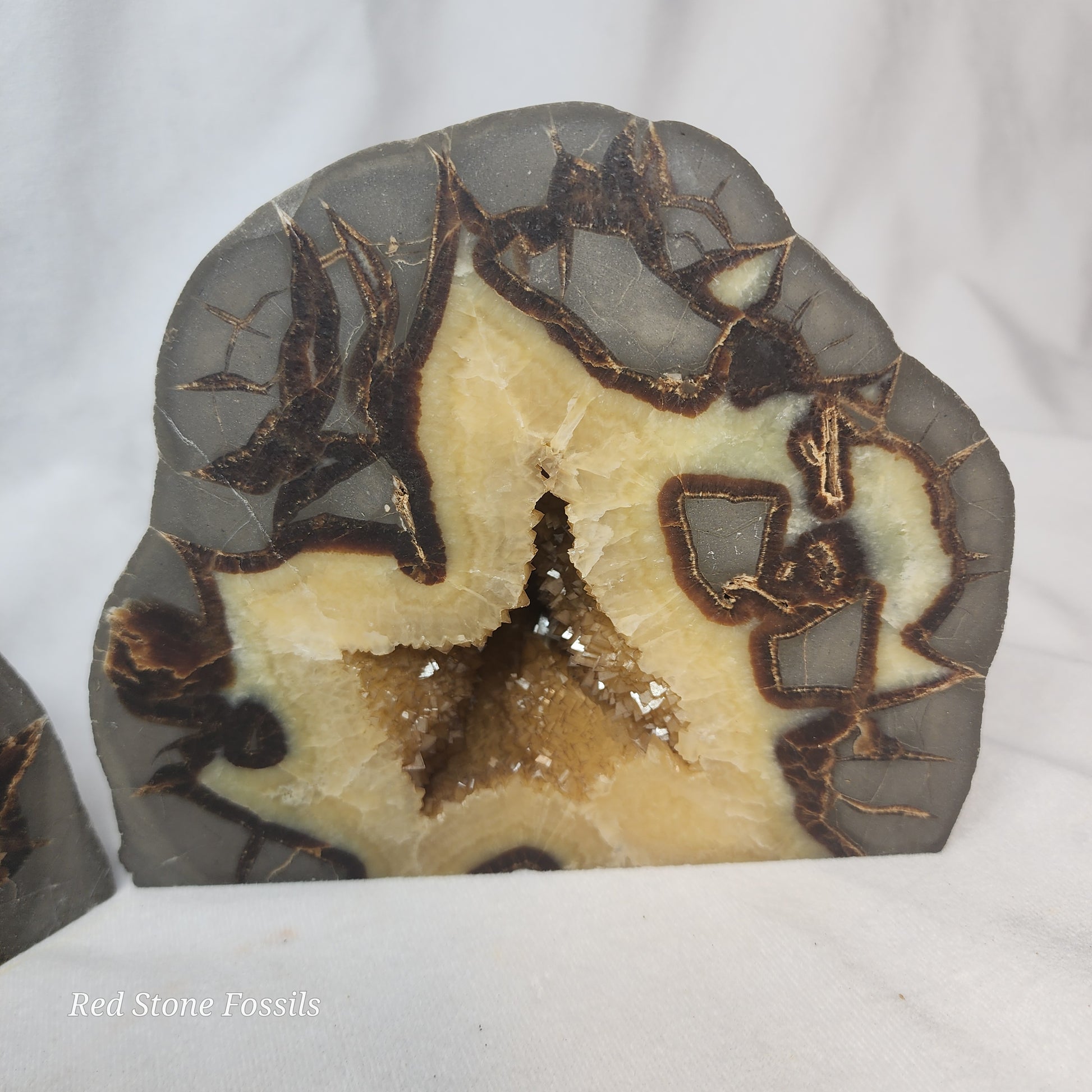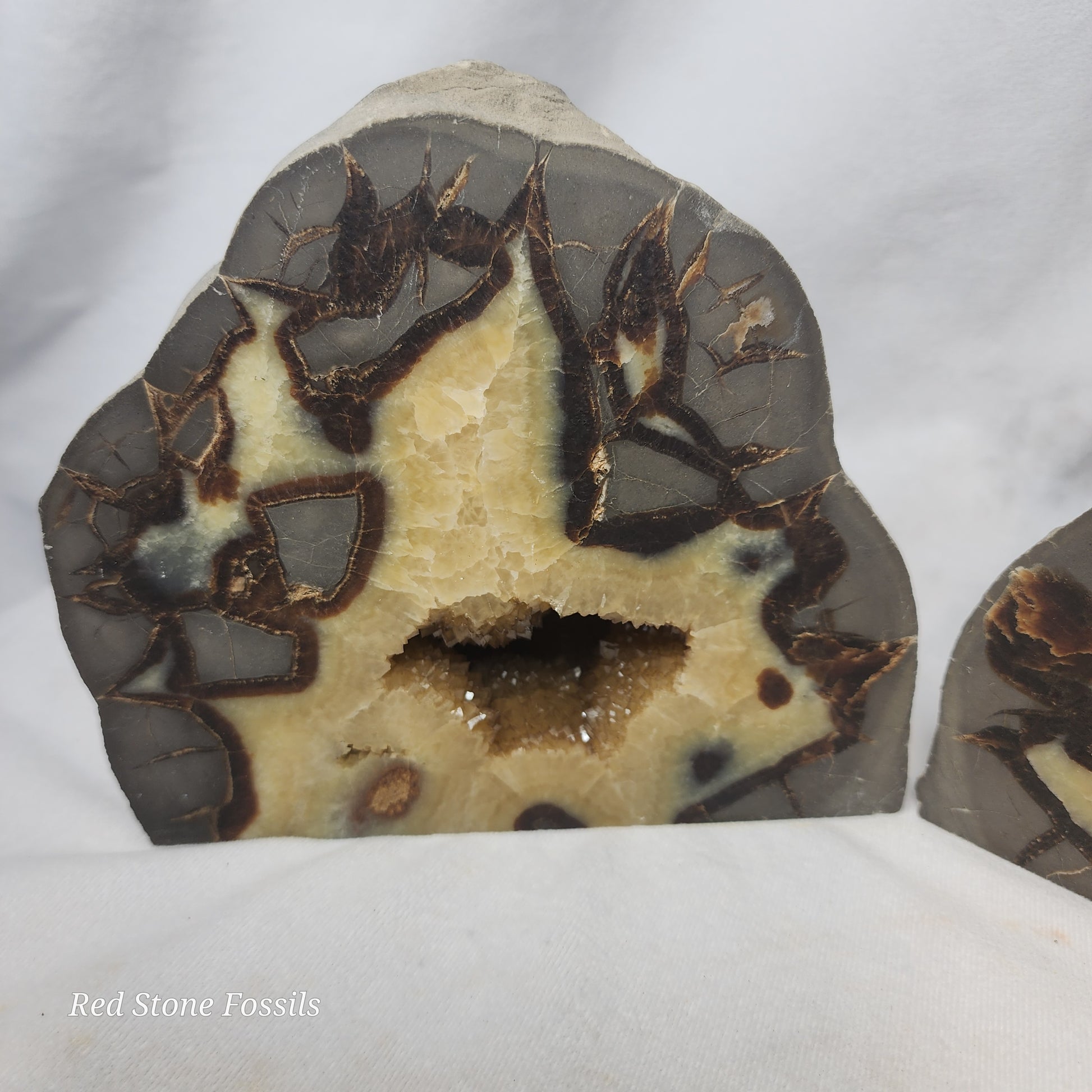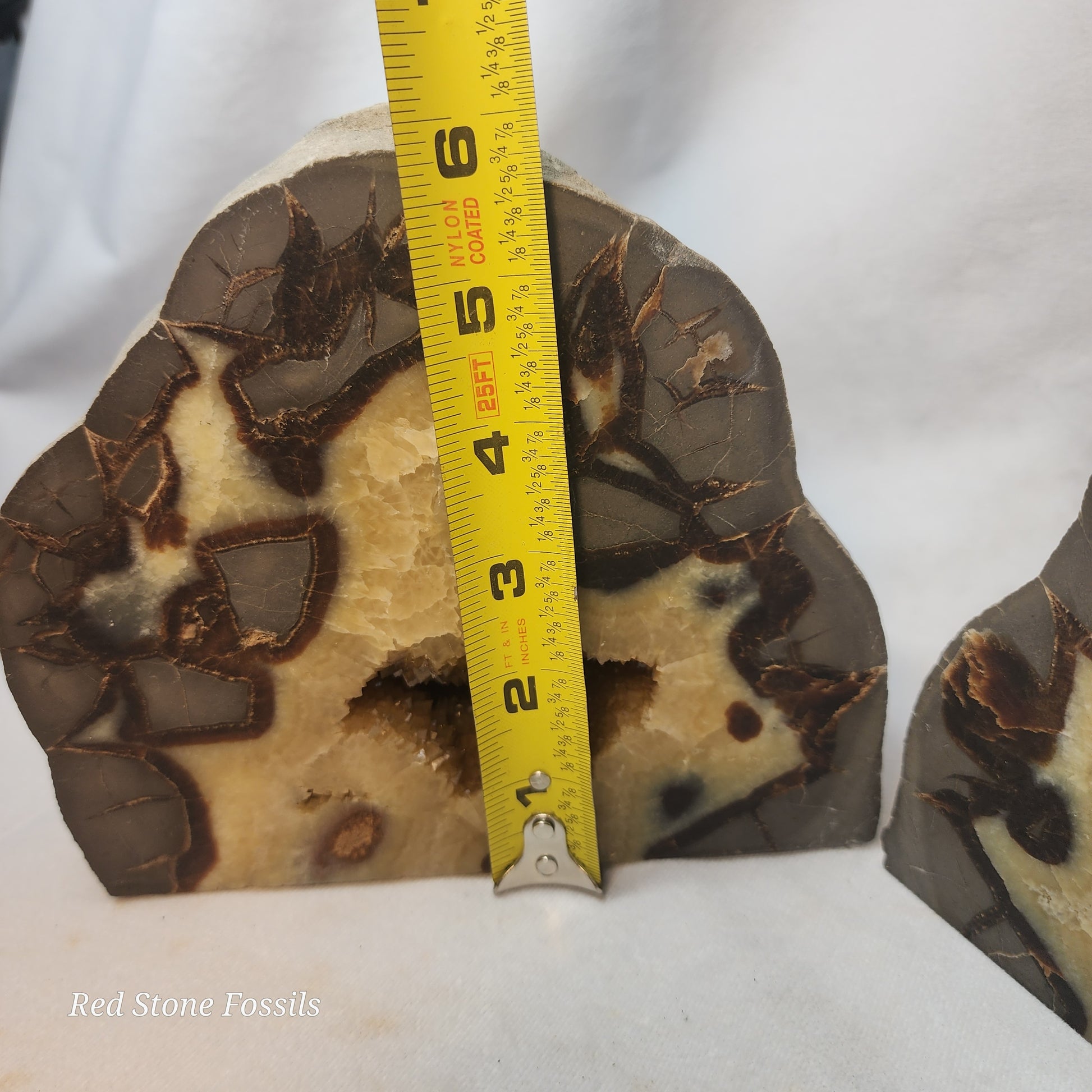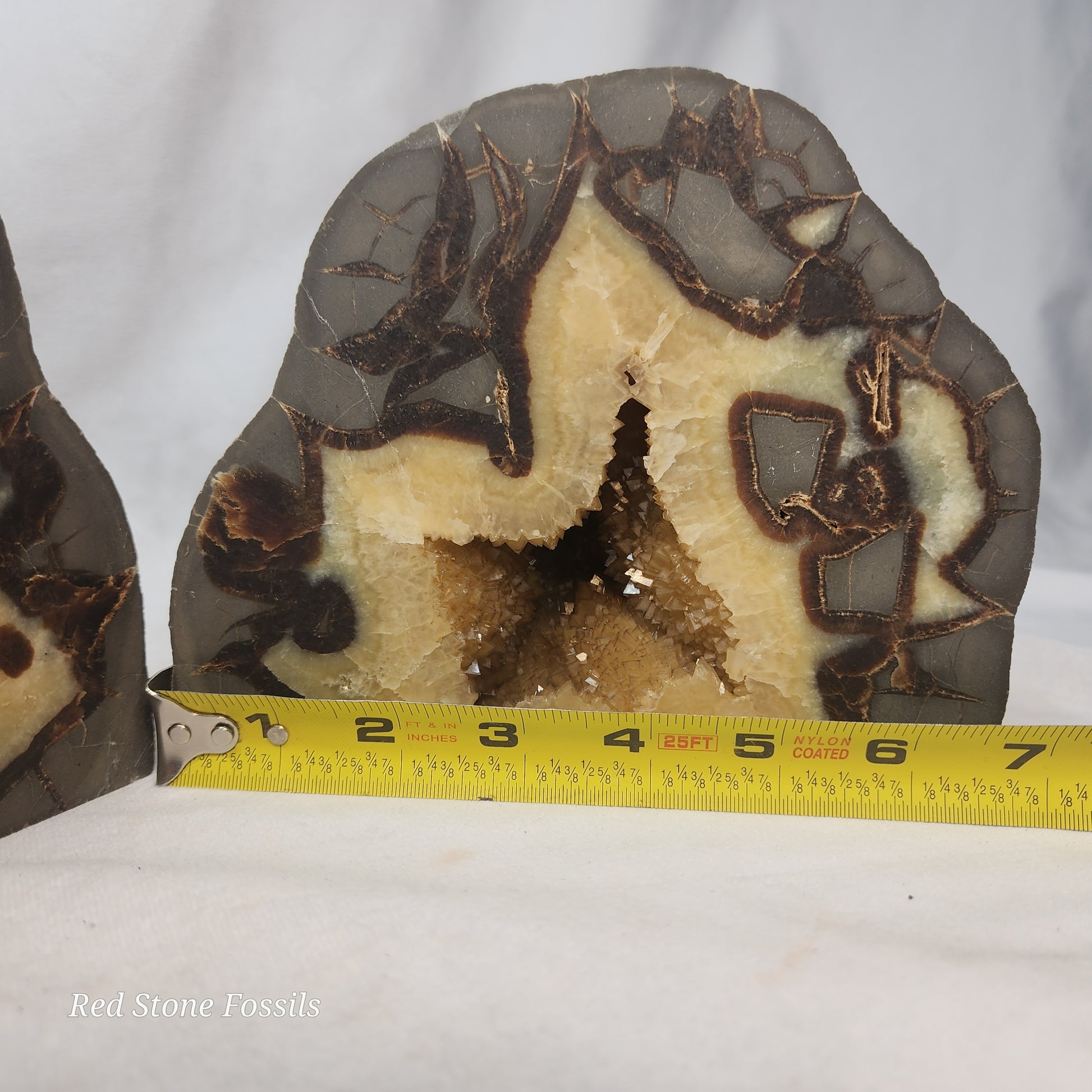 This Septarian Nodule is perfect for the book shelf as bookends! It has been split and polished to show the gorgeous yellow and brown mineral patches along with the crystal cavities inside! This is truly an aesthetically pleasing piece!