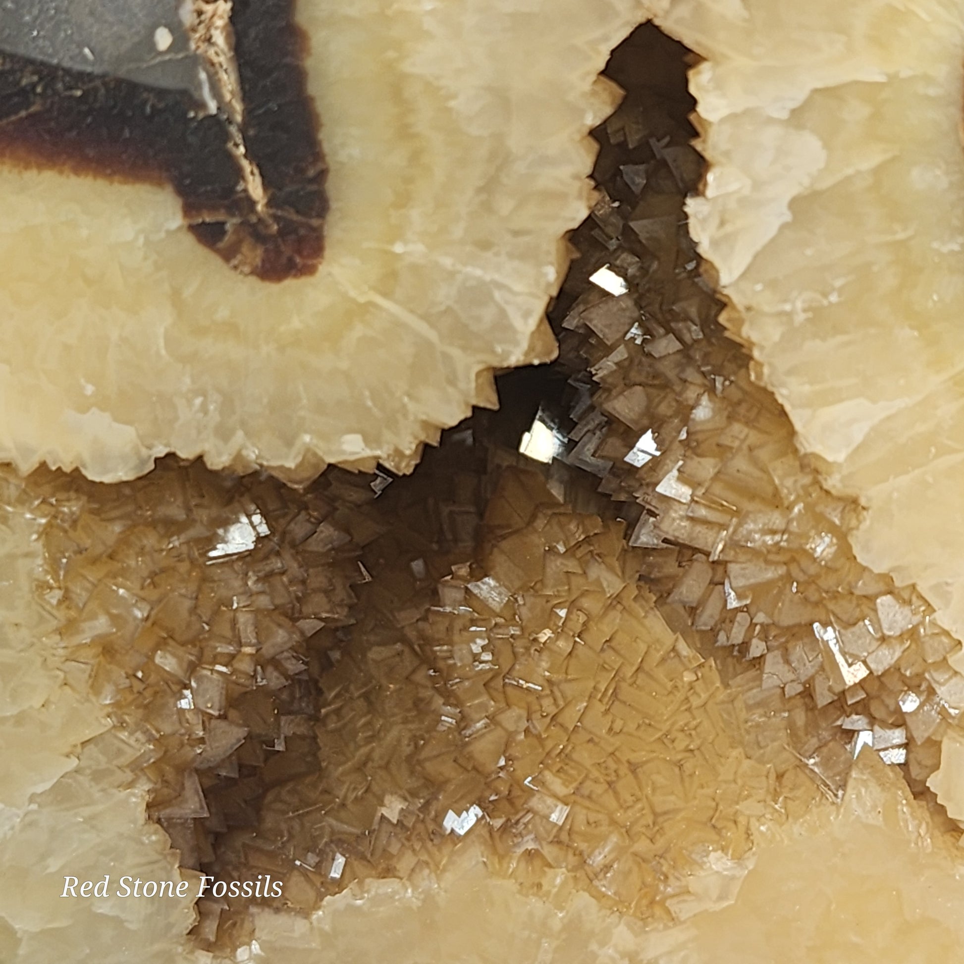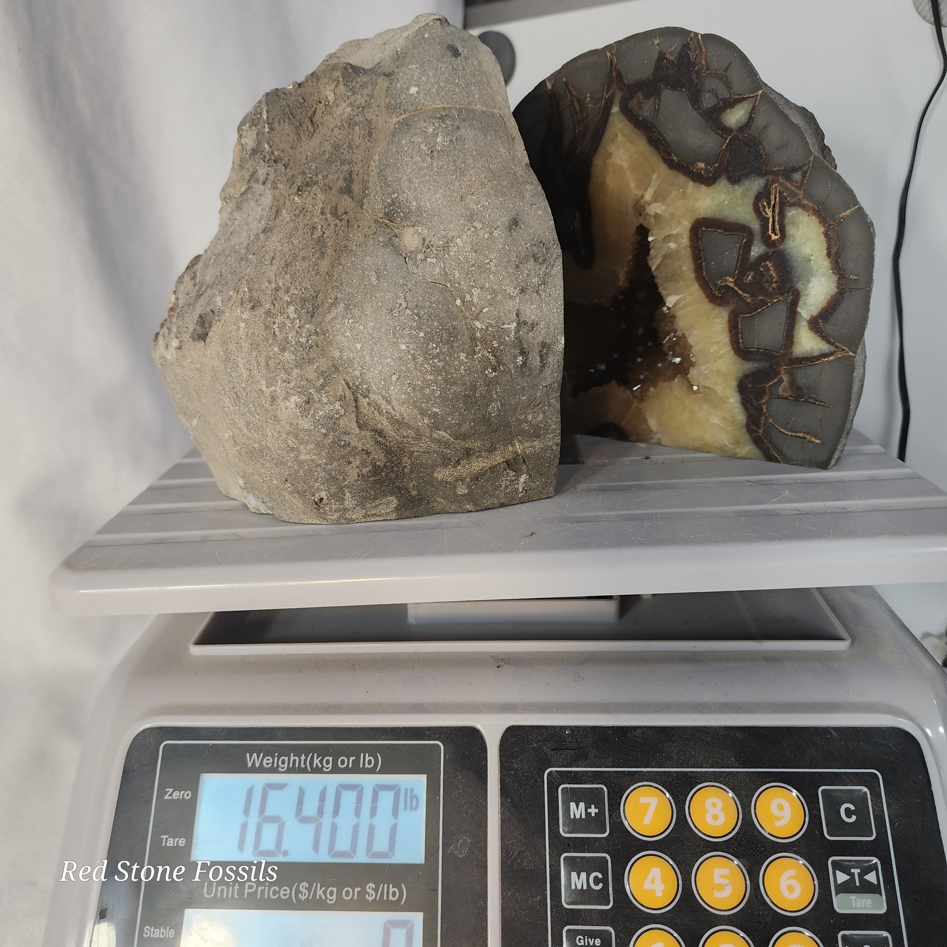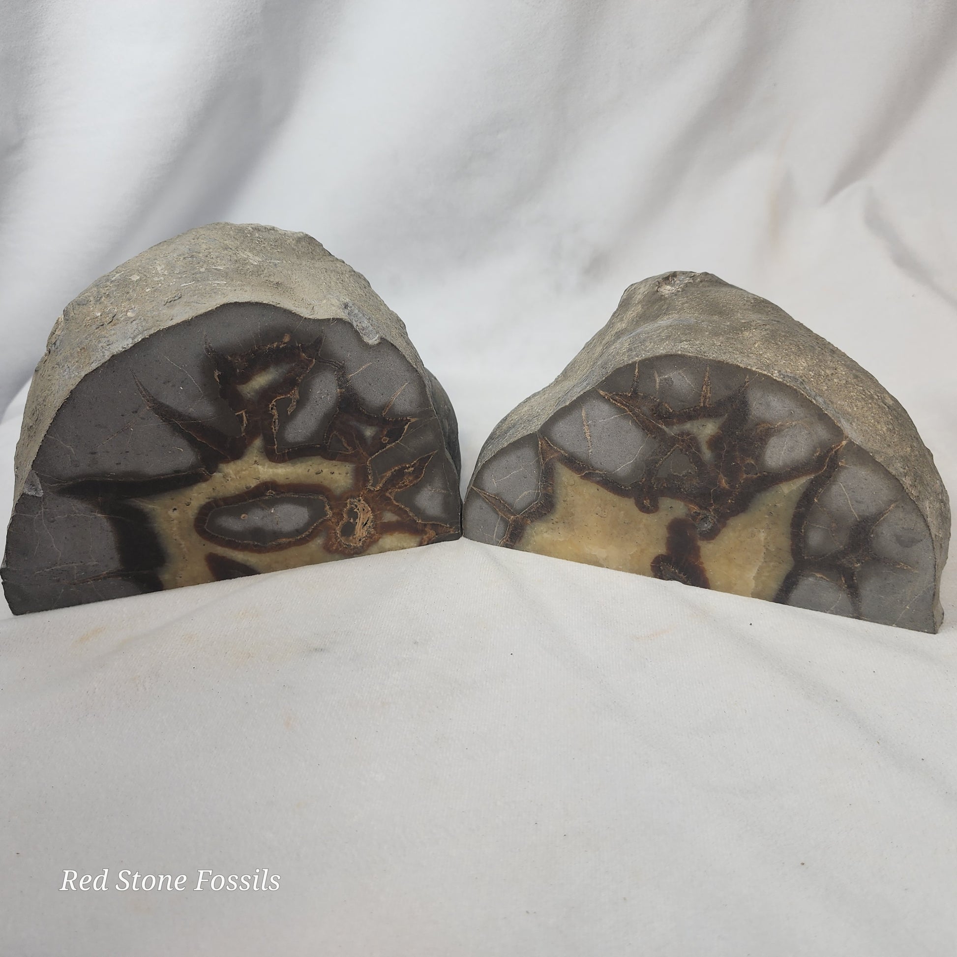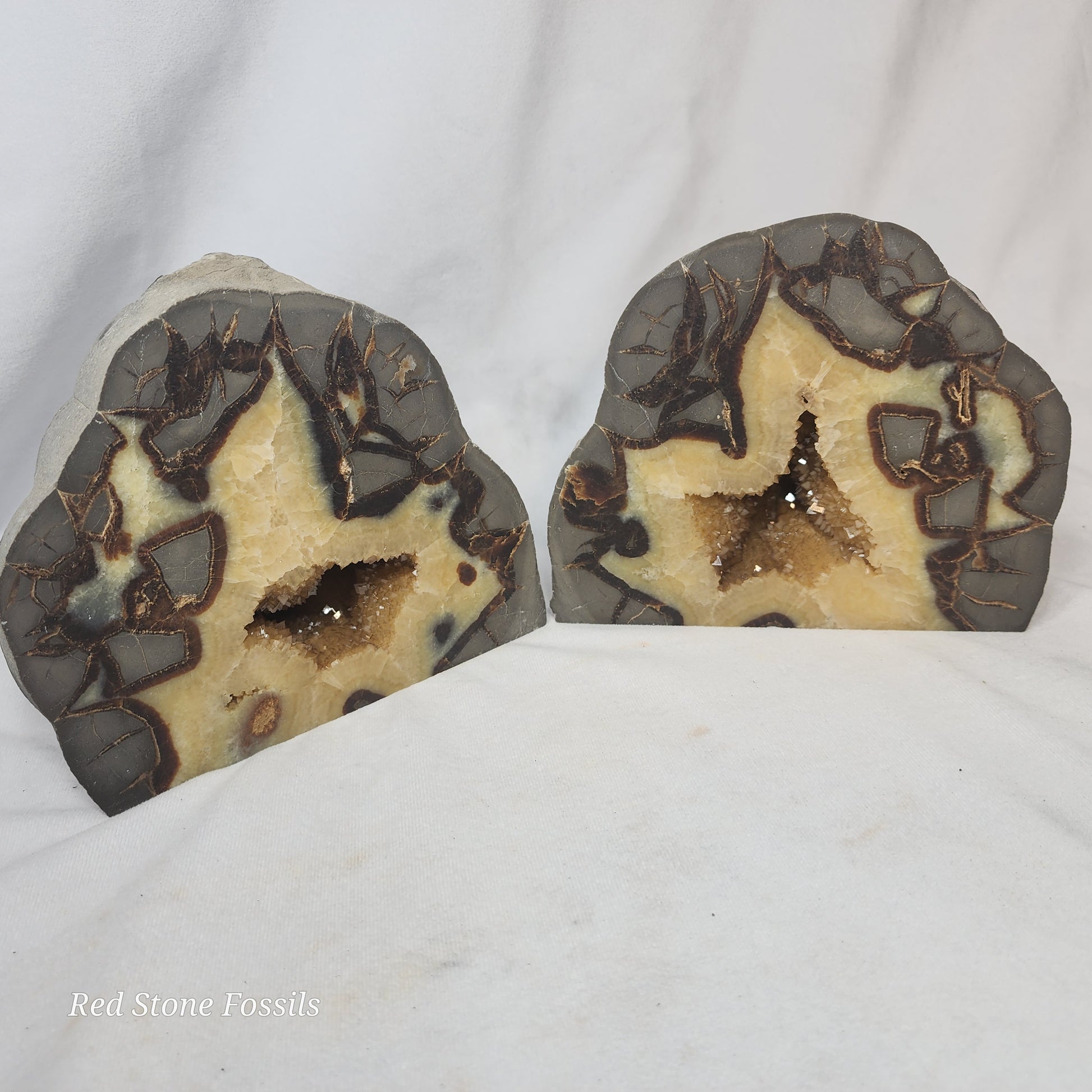 This Septarian Nodule is perfect for the book shelf as bookends! It has been split and polished to show the gorgeous yellow and brown mineral patches along with the crystal cavities inside! This is truly an aesthetically pleasing piece!