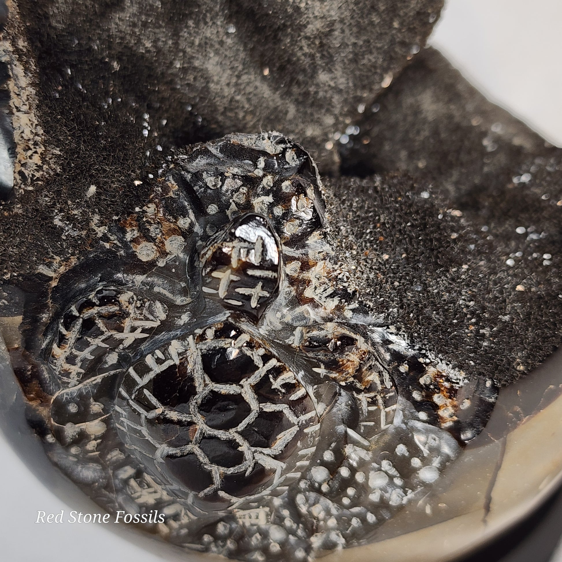 This particular specimen has two terrific turtles carved along the edge of the egg and beautiful druzy black and white crystals inside. Although this egg looks great on a shelf displayed by itself, it also pairs nicely with our Desert Roses!