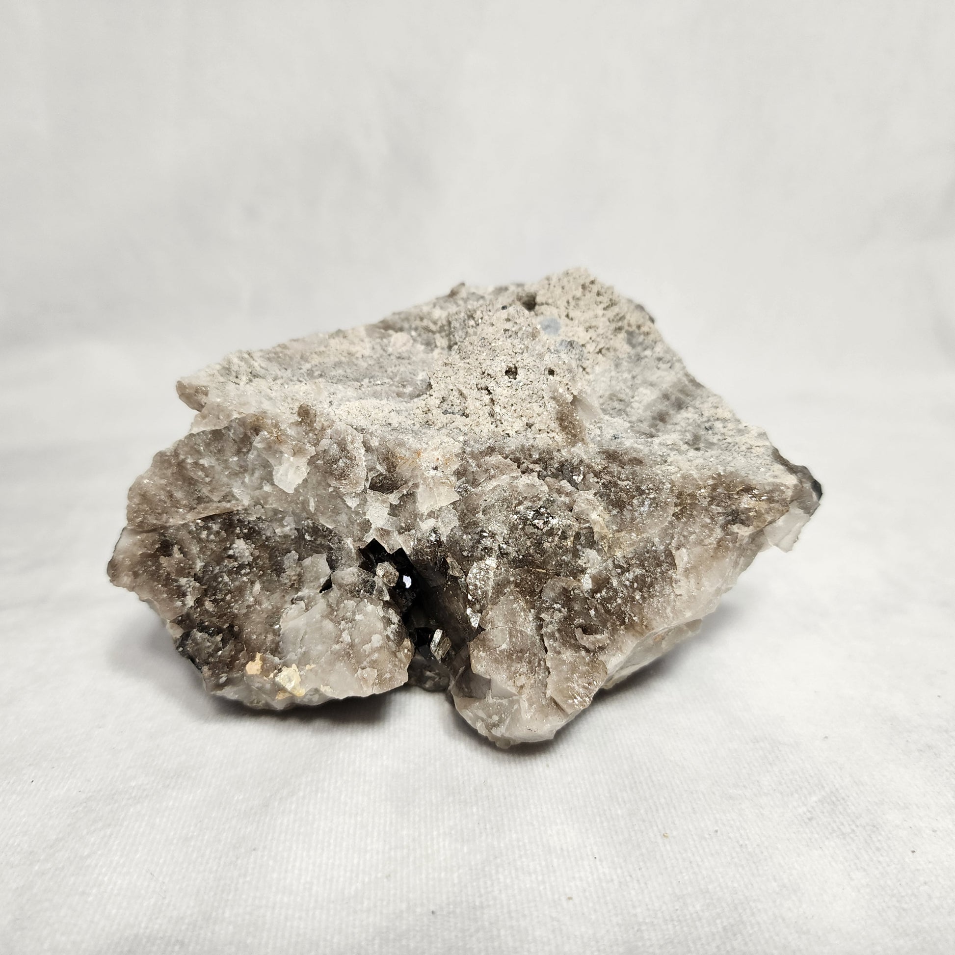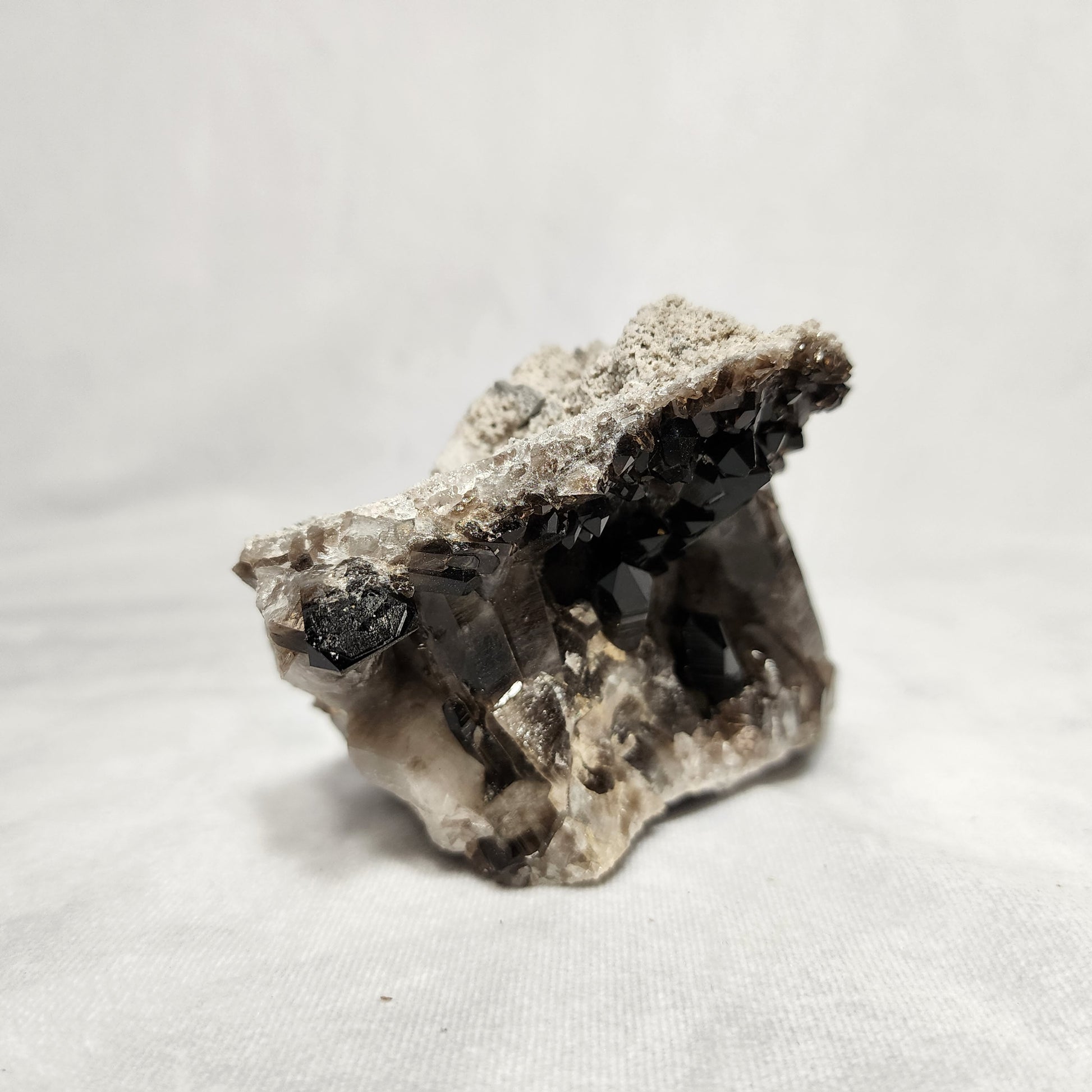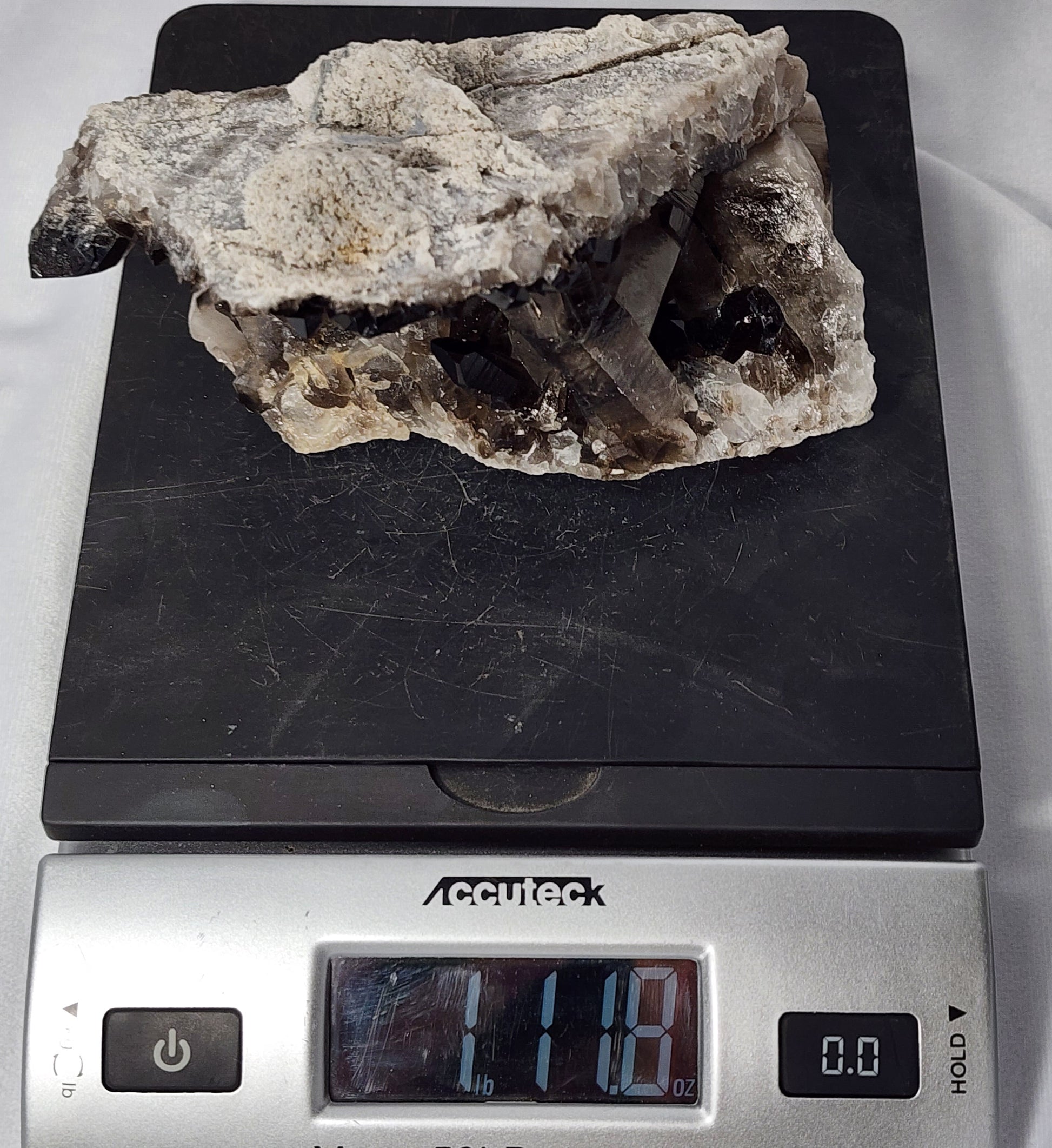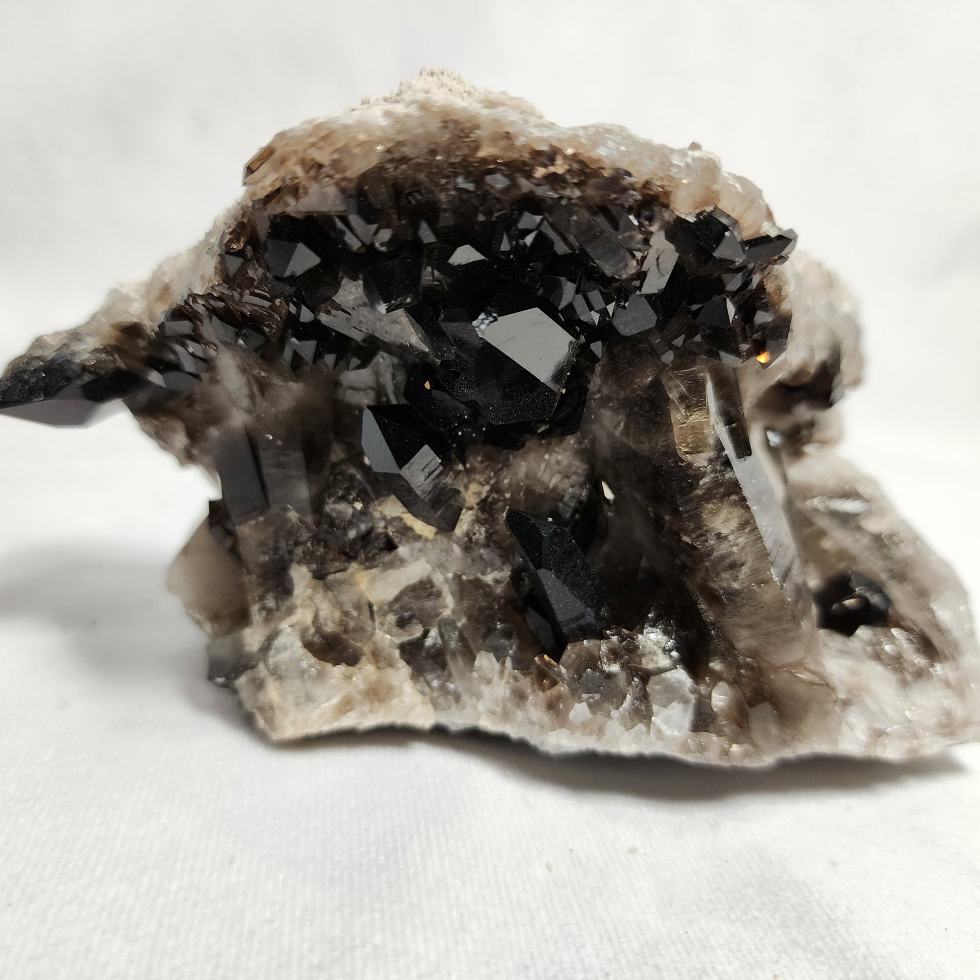 This particular piece has several different sized points with a variety of gray and black colors! Smoky Quartz looks astonishing on its own, but also pairs nicely with our Orthoceras towers and Purple Fluorite!