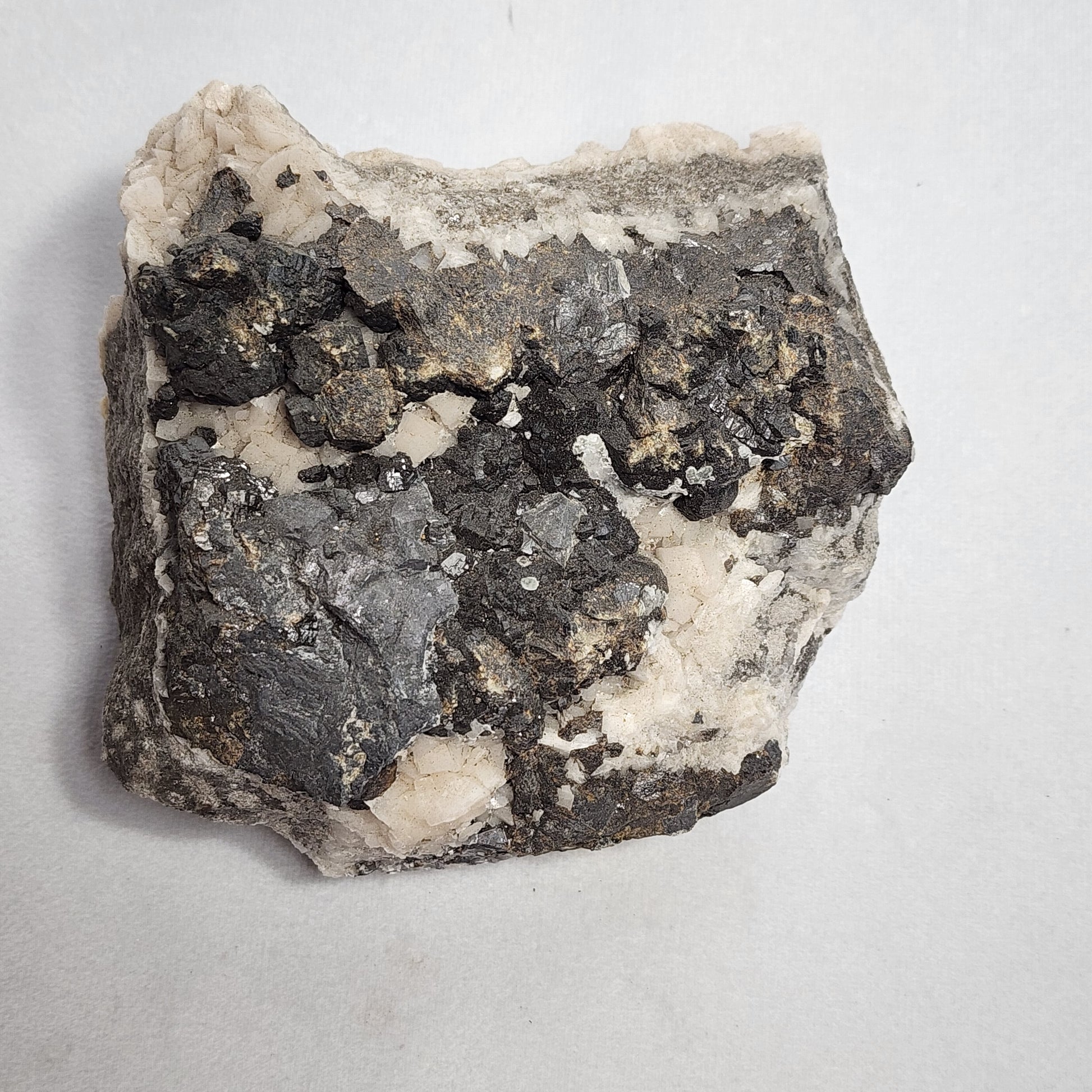 Galena is an ore mineral of lead. On this piece the black, ore nodules of Galena just gleam when under the light!