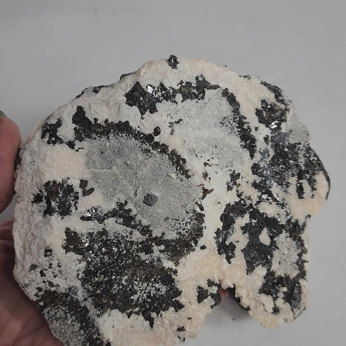 Galena is an ore mineral of lead. On this piece the black, ore nodules of Galena just sparkles when the light hits it!