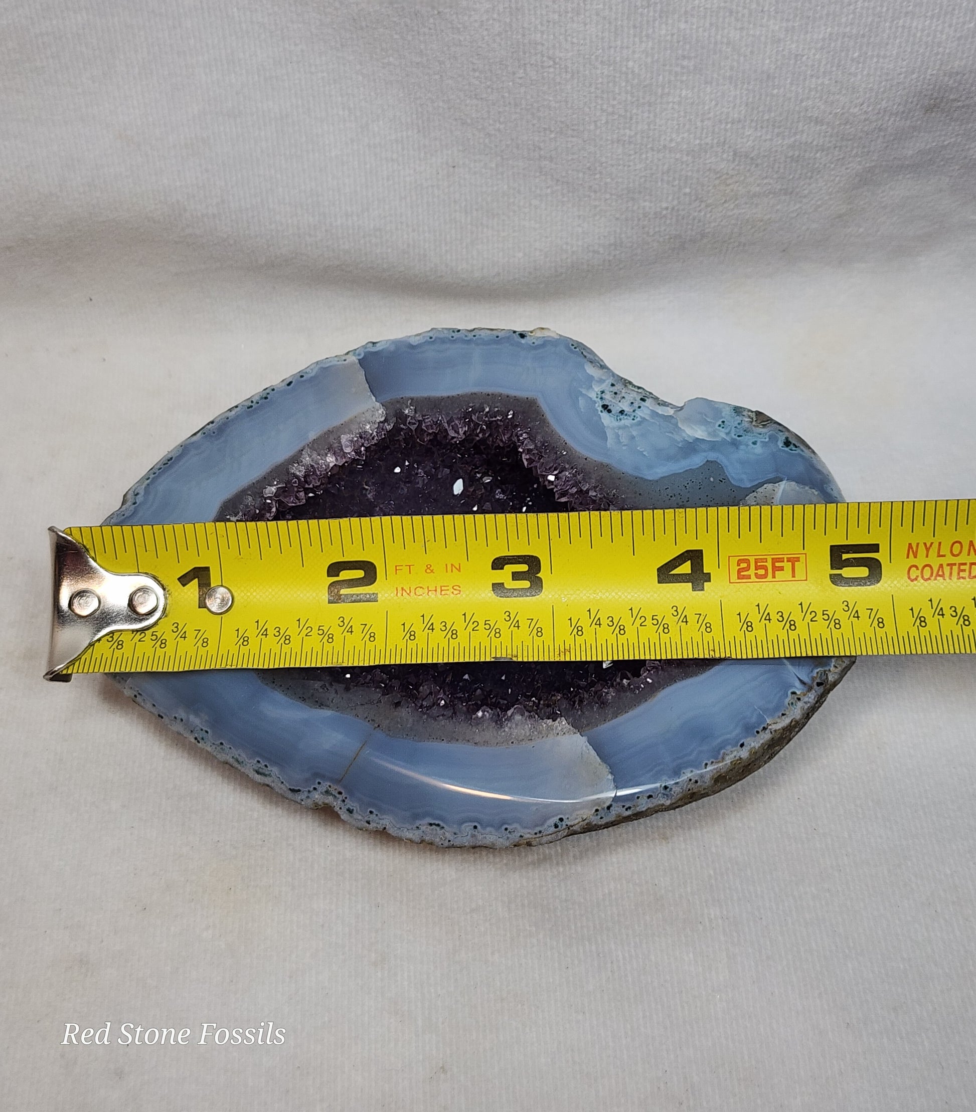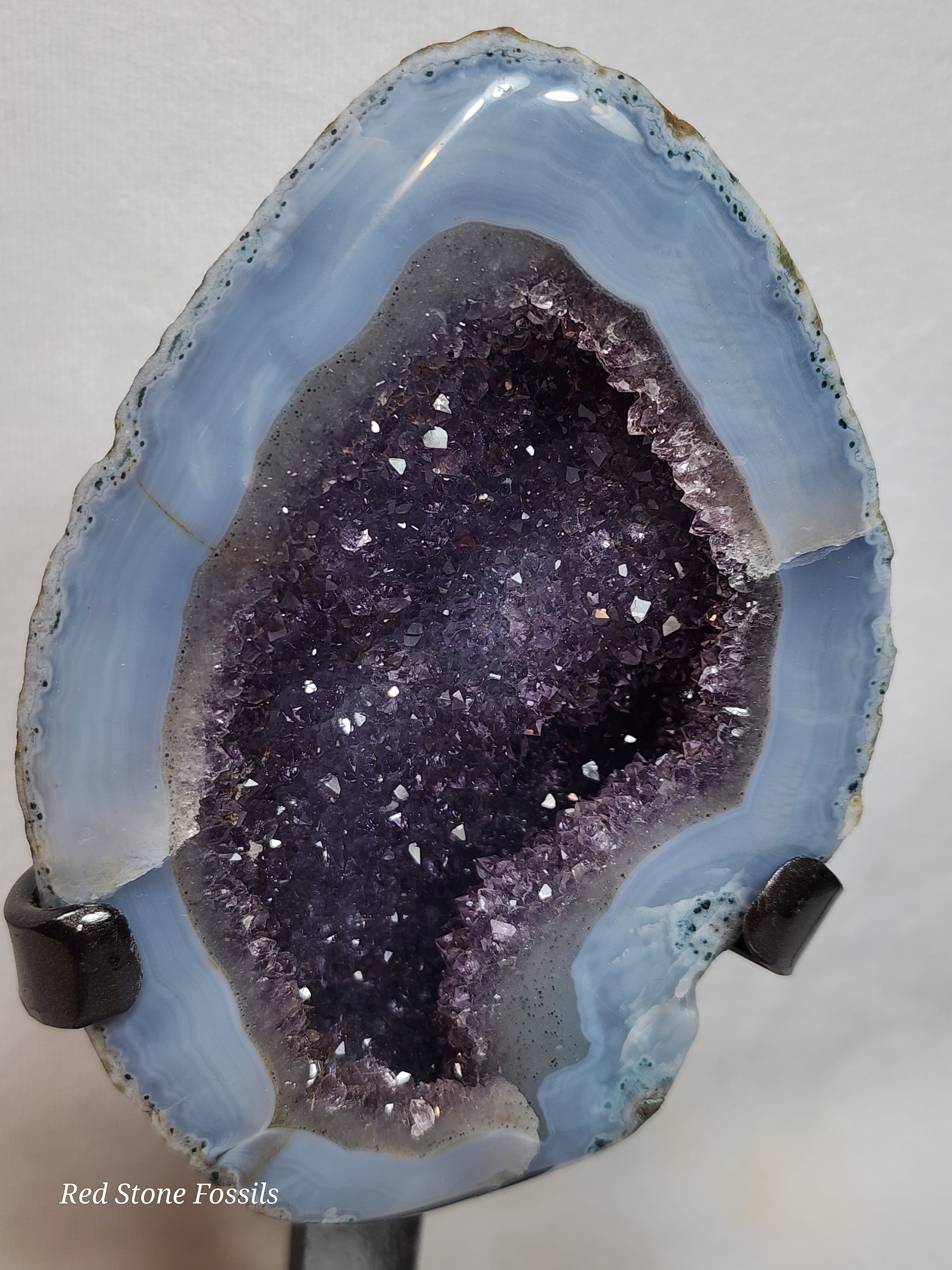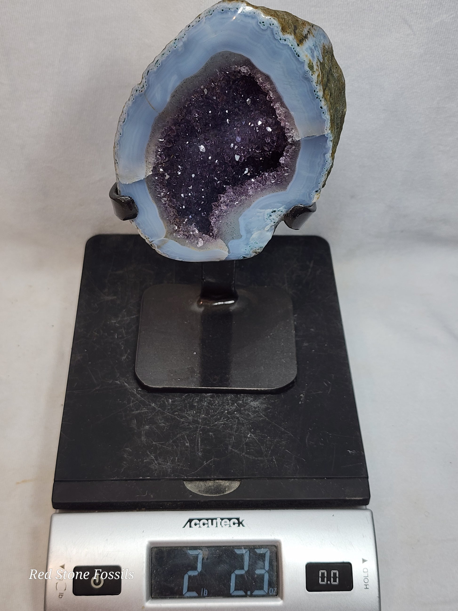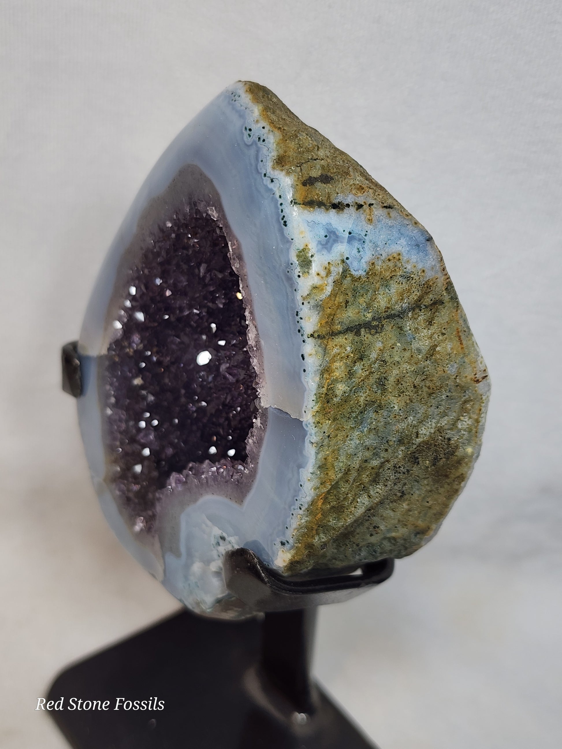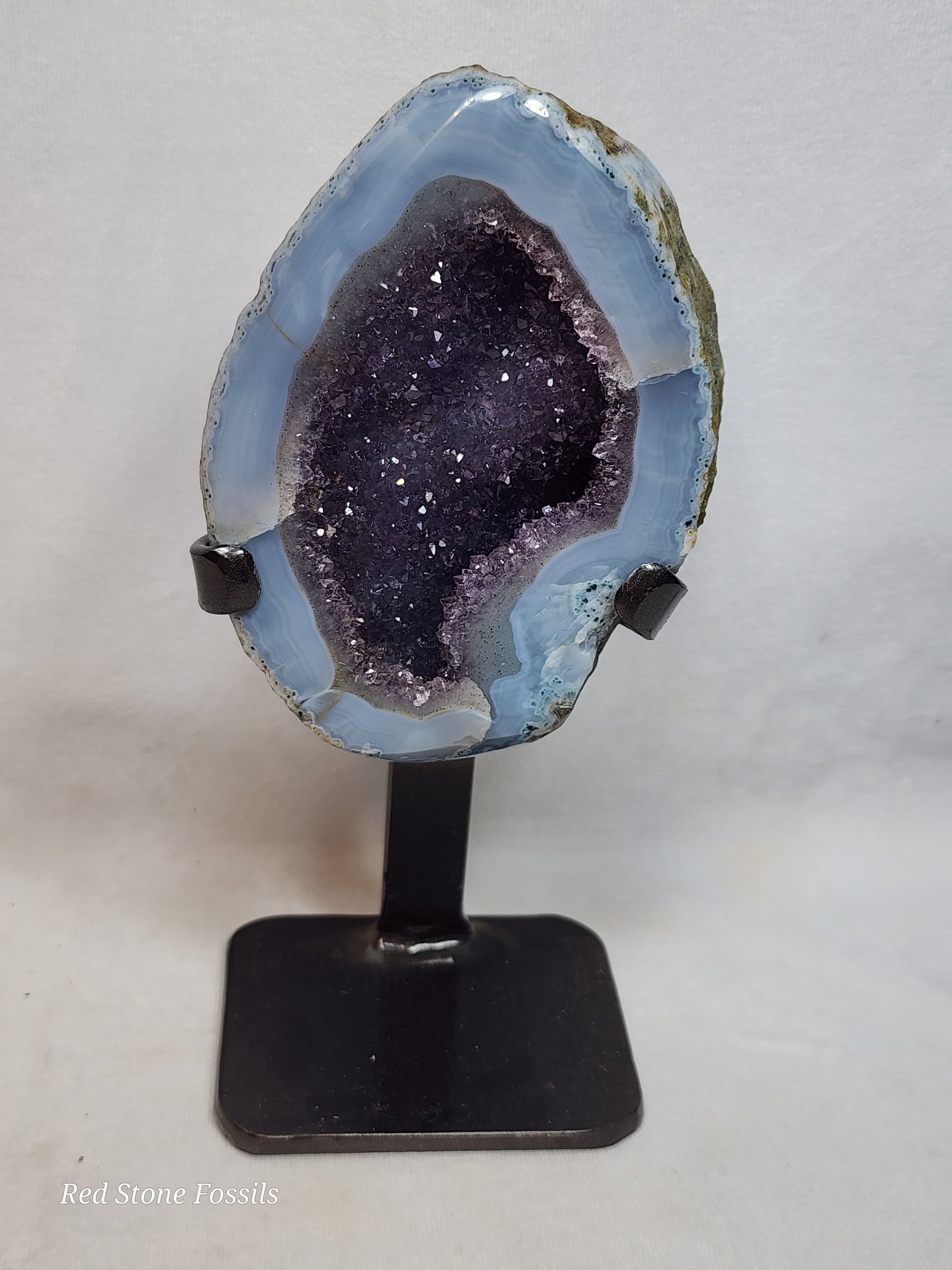 This particular Amethyst has a stand to show off the beauty and elegance of the purple crystals and the stunning blue outer geode! The stand will be included with purchase.