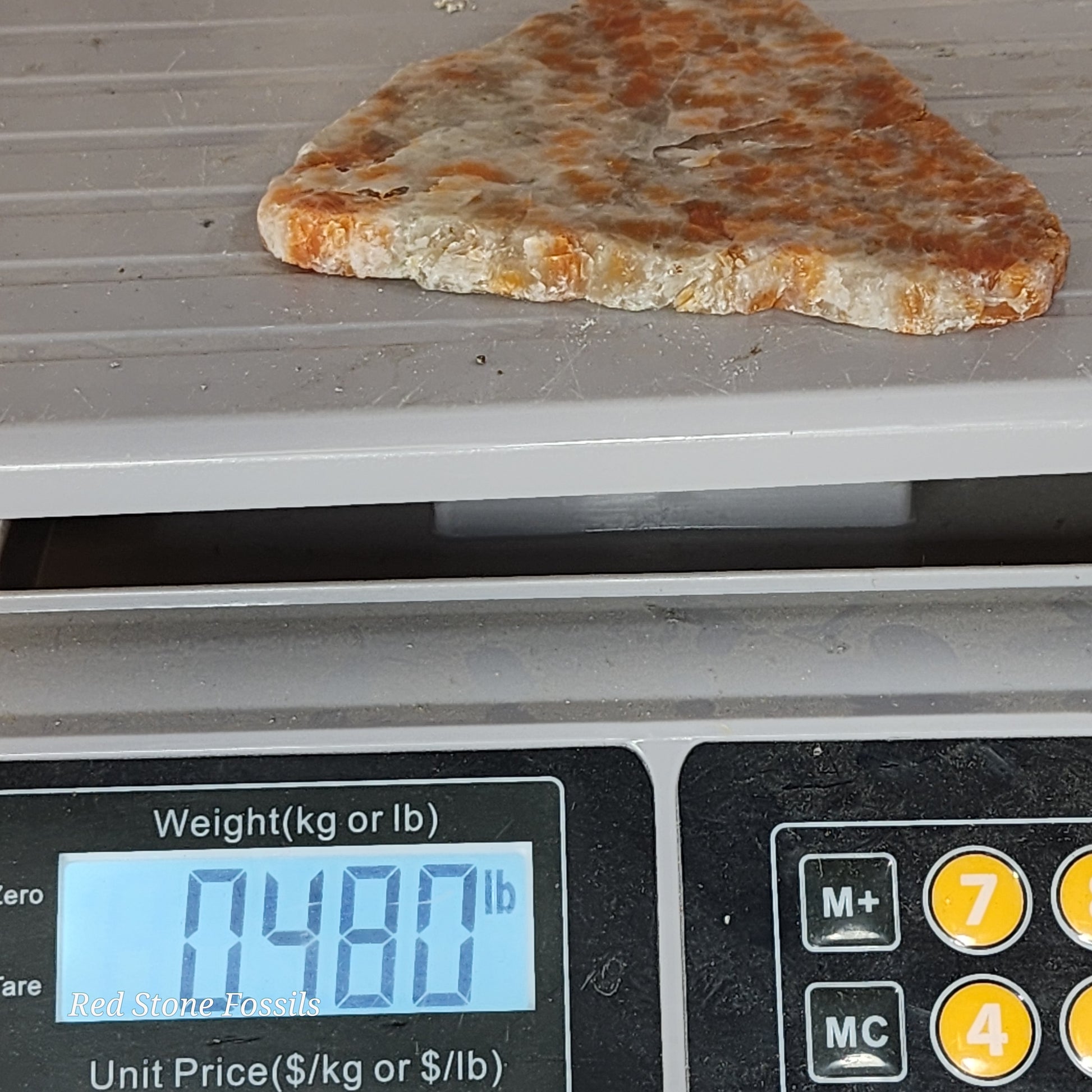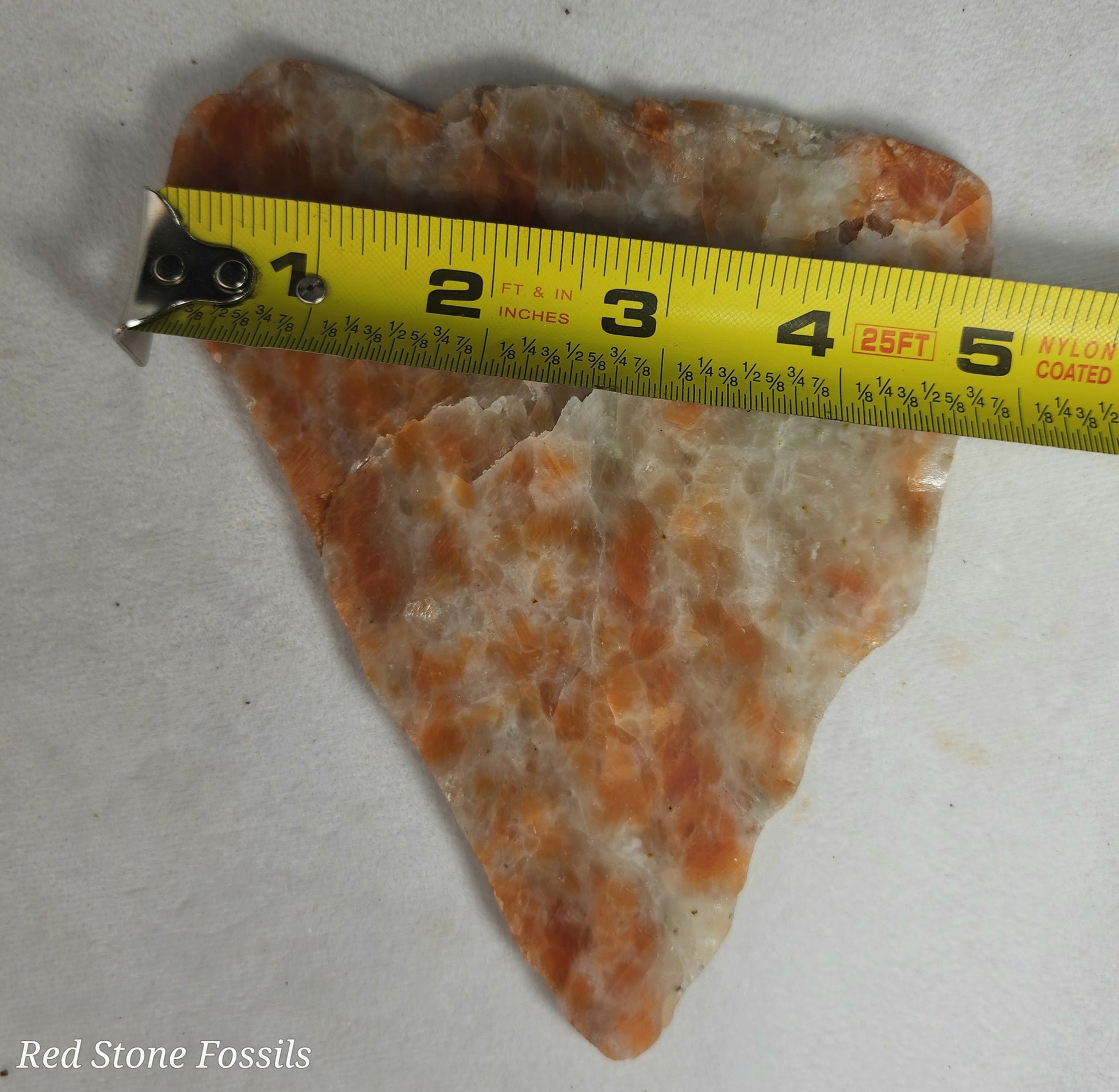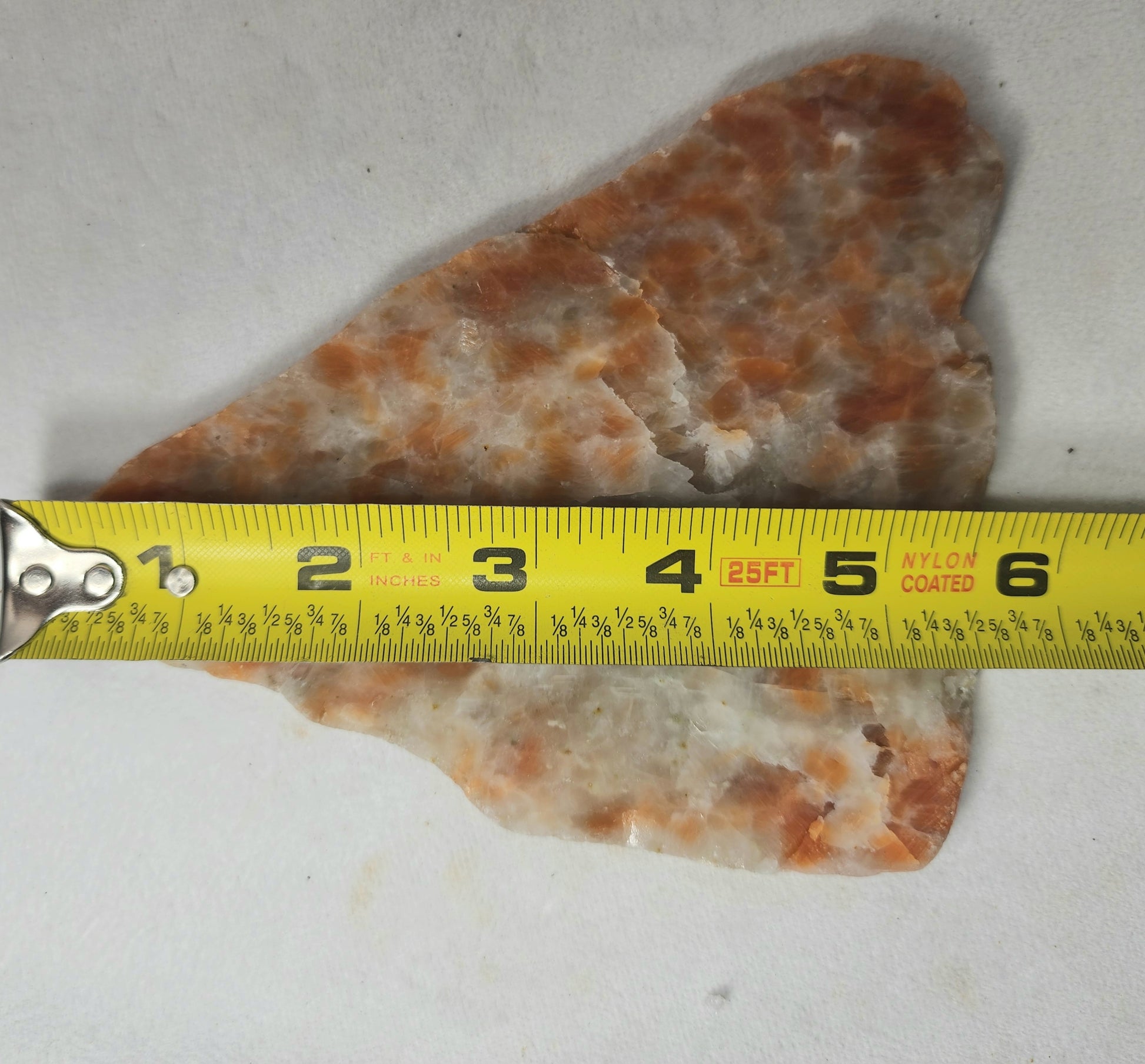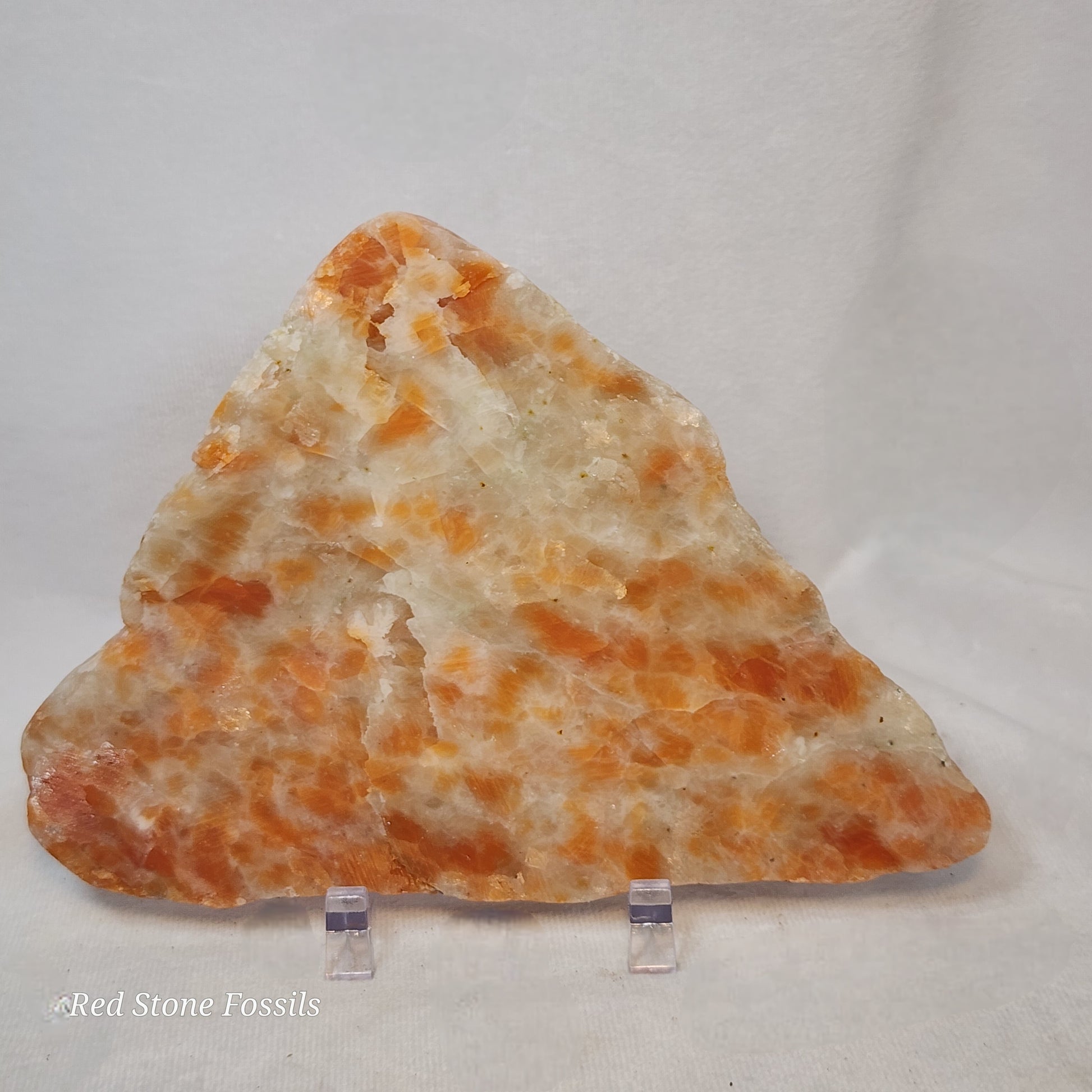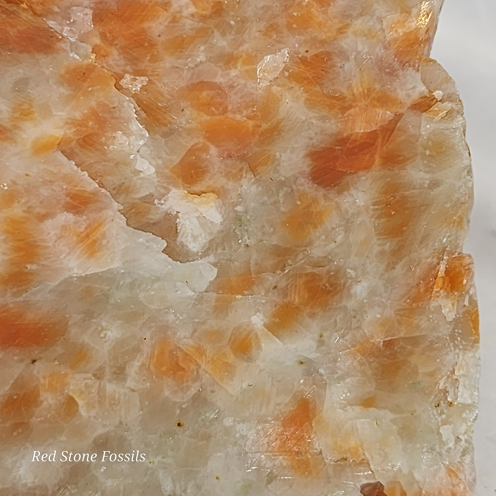 This specific slab is Sunstone. The fun orange and white "cream-sicle" color of this natural mineral is stunning!