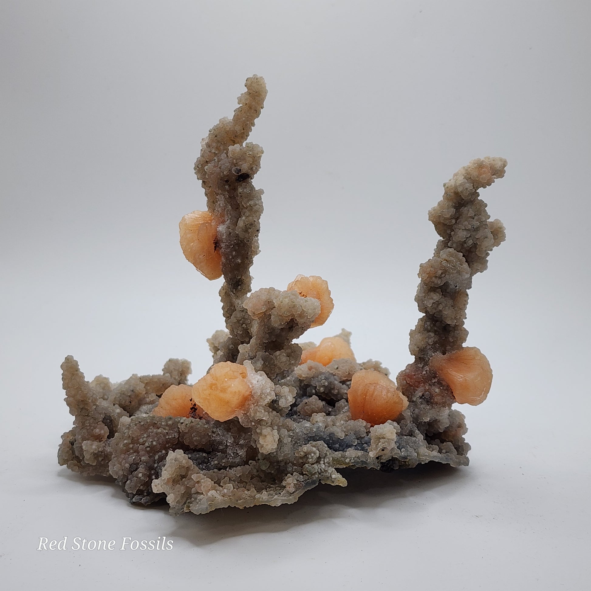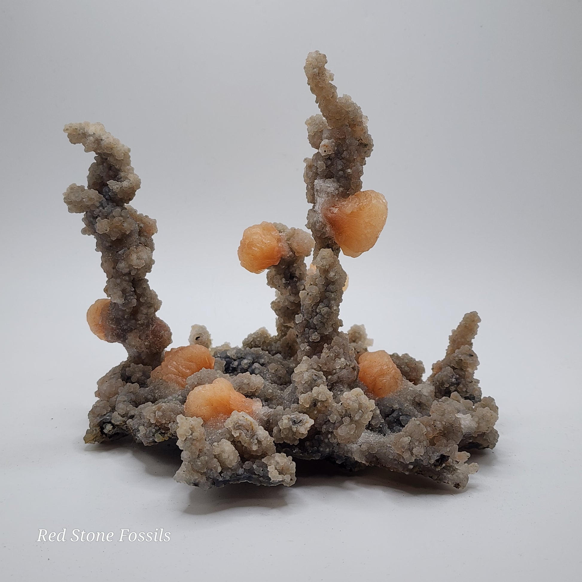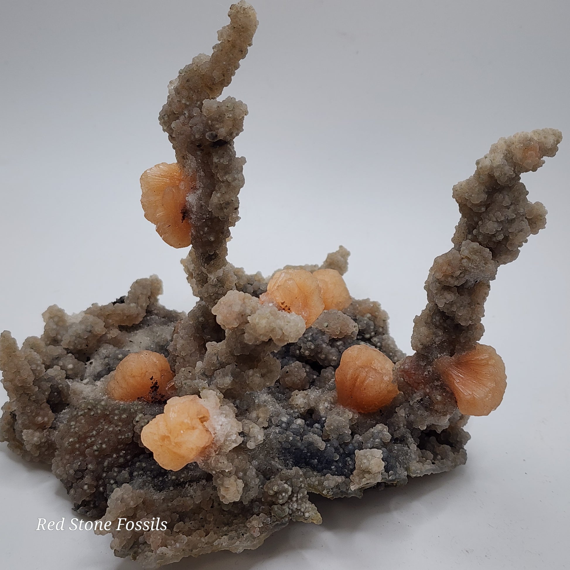 This very unique specimen from India has stunning salmon-pink Stilbite on towers and beams of multi-colored chalcedony!