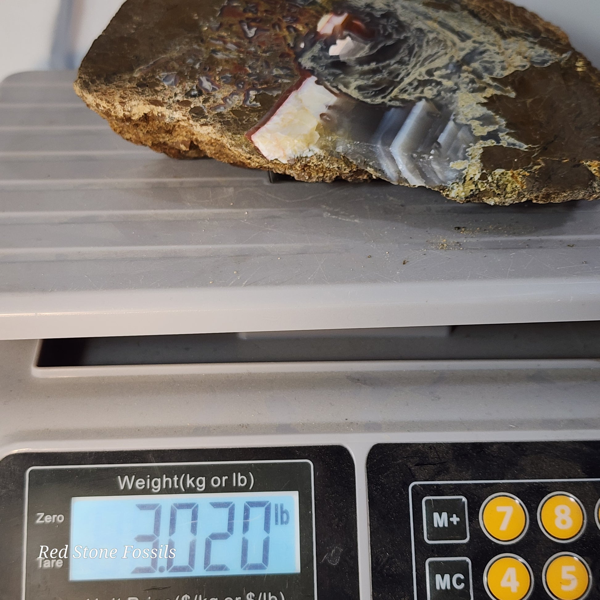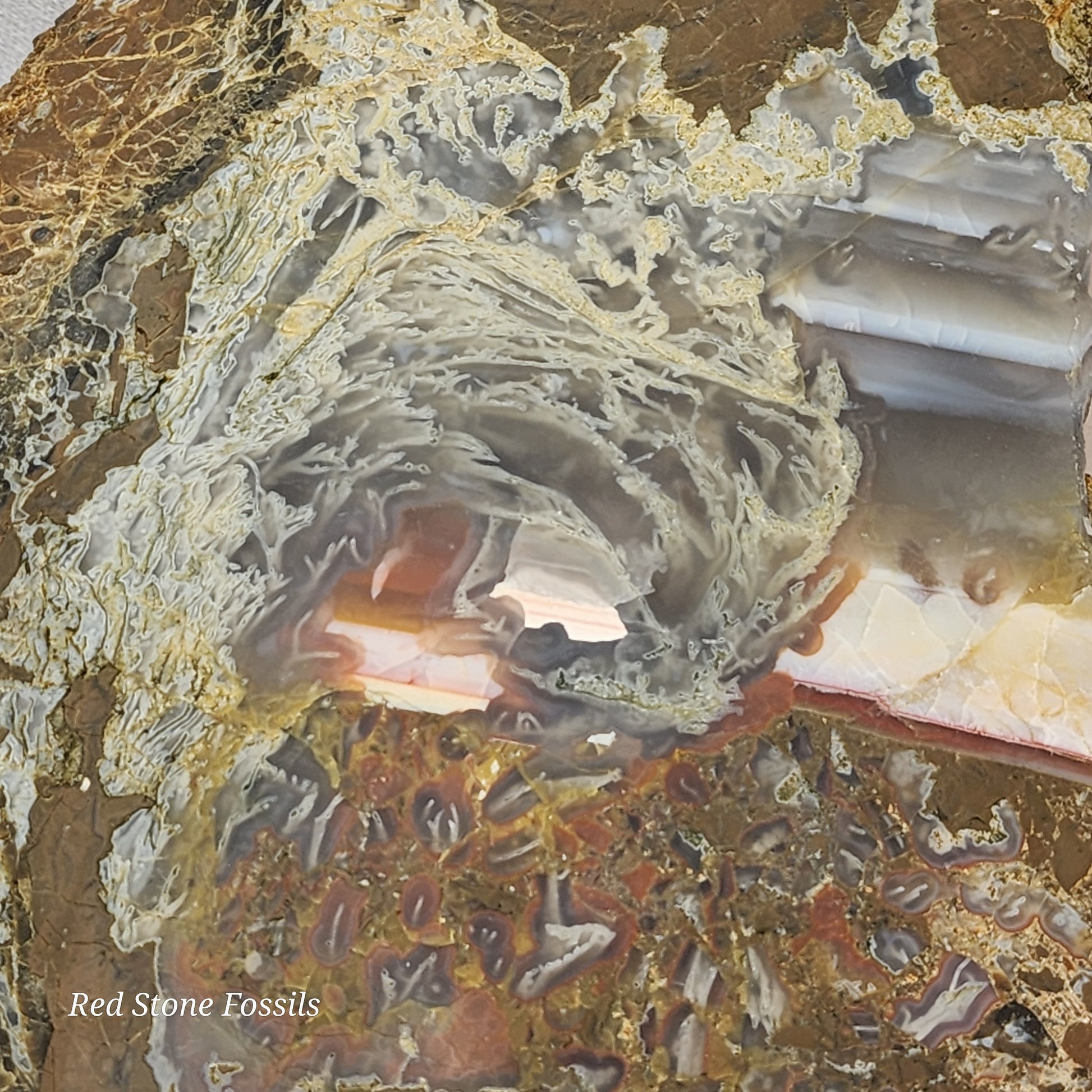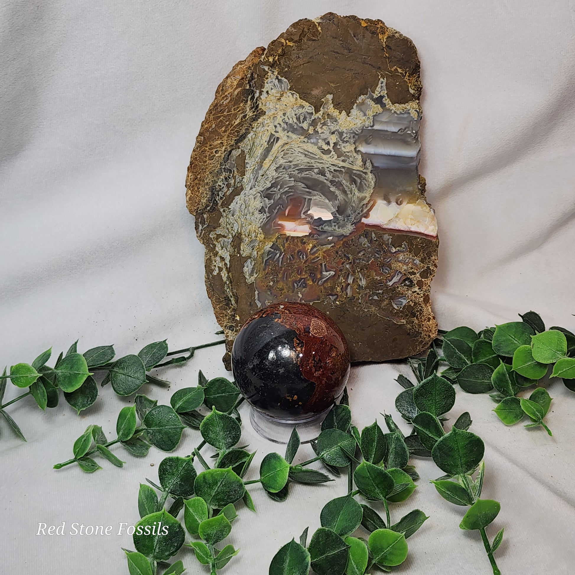 This particular specimen has been split and polished on one side to show off the gorgeous minerals inside! Just look at this beauty with the different blends of red, white, browns and blues! The very unique mineral veins make this a spectacular specimen to own! Pair with our Moss Agate Sphere for a breathtaking display!