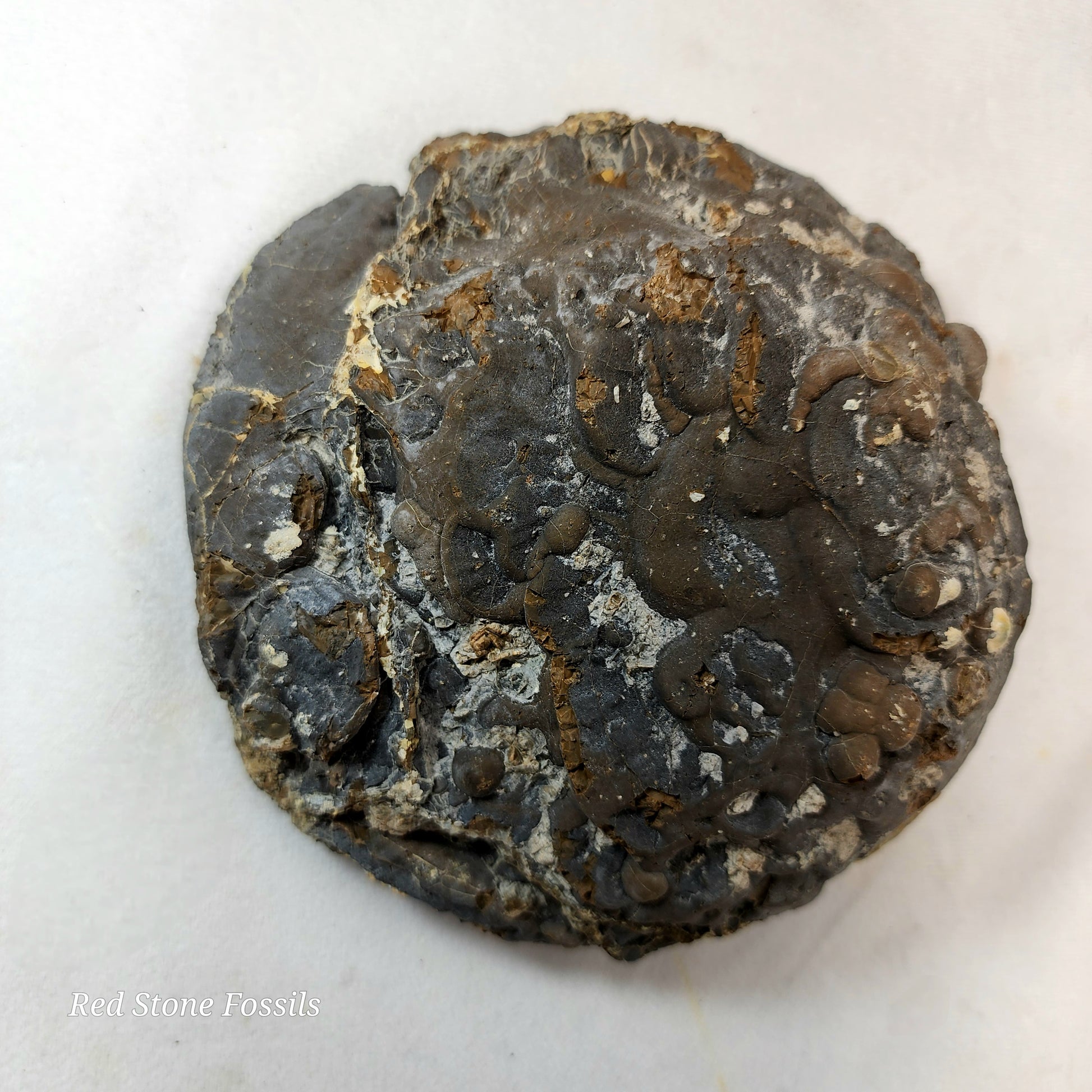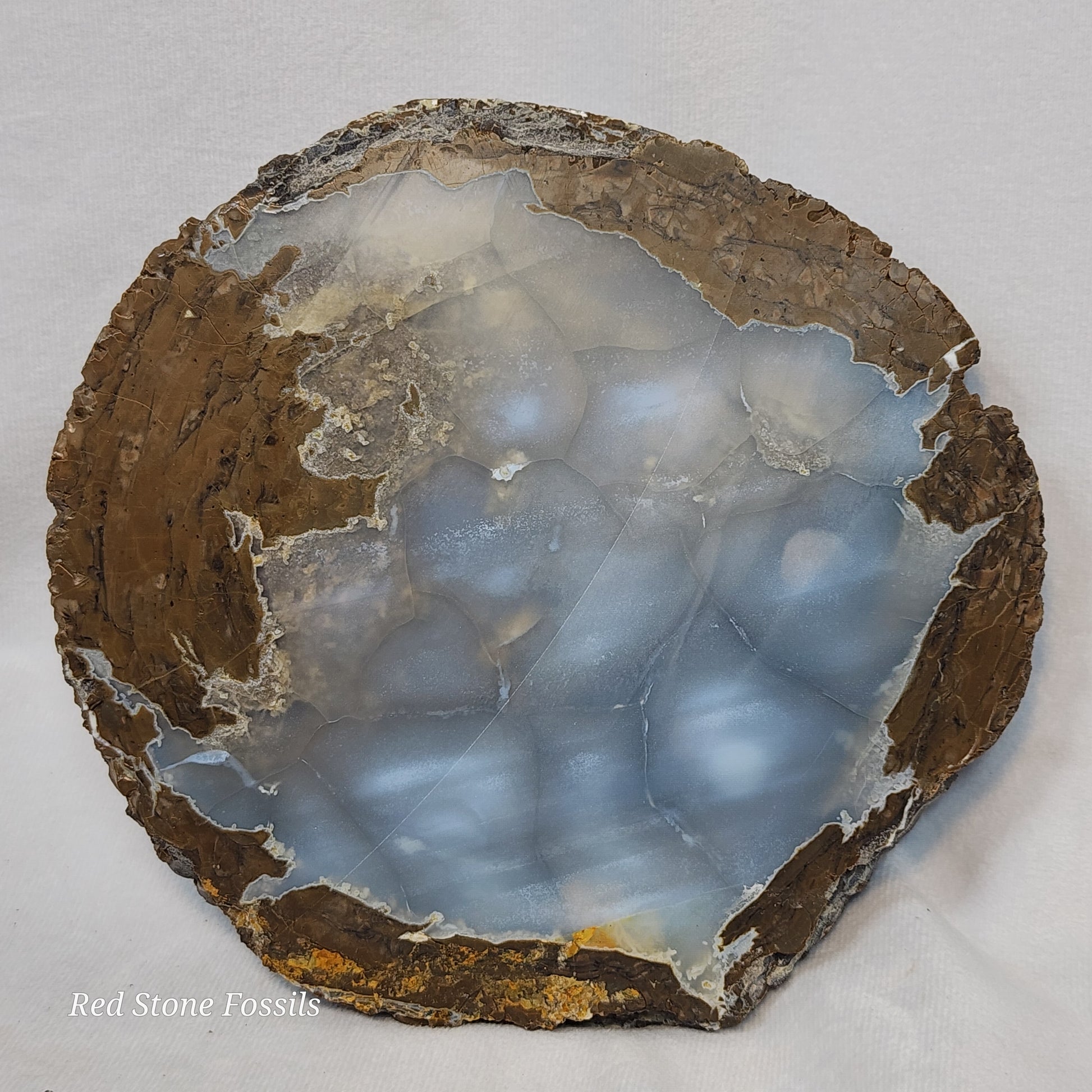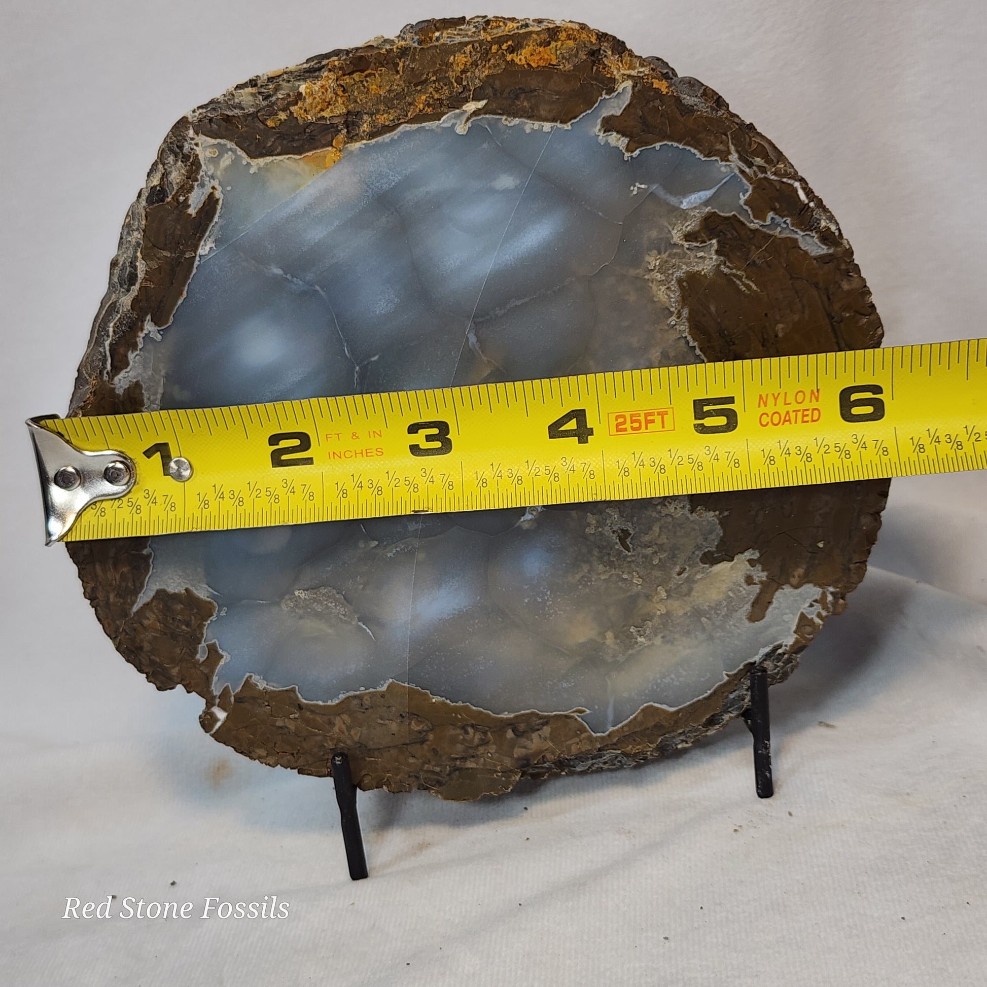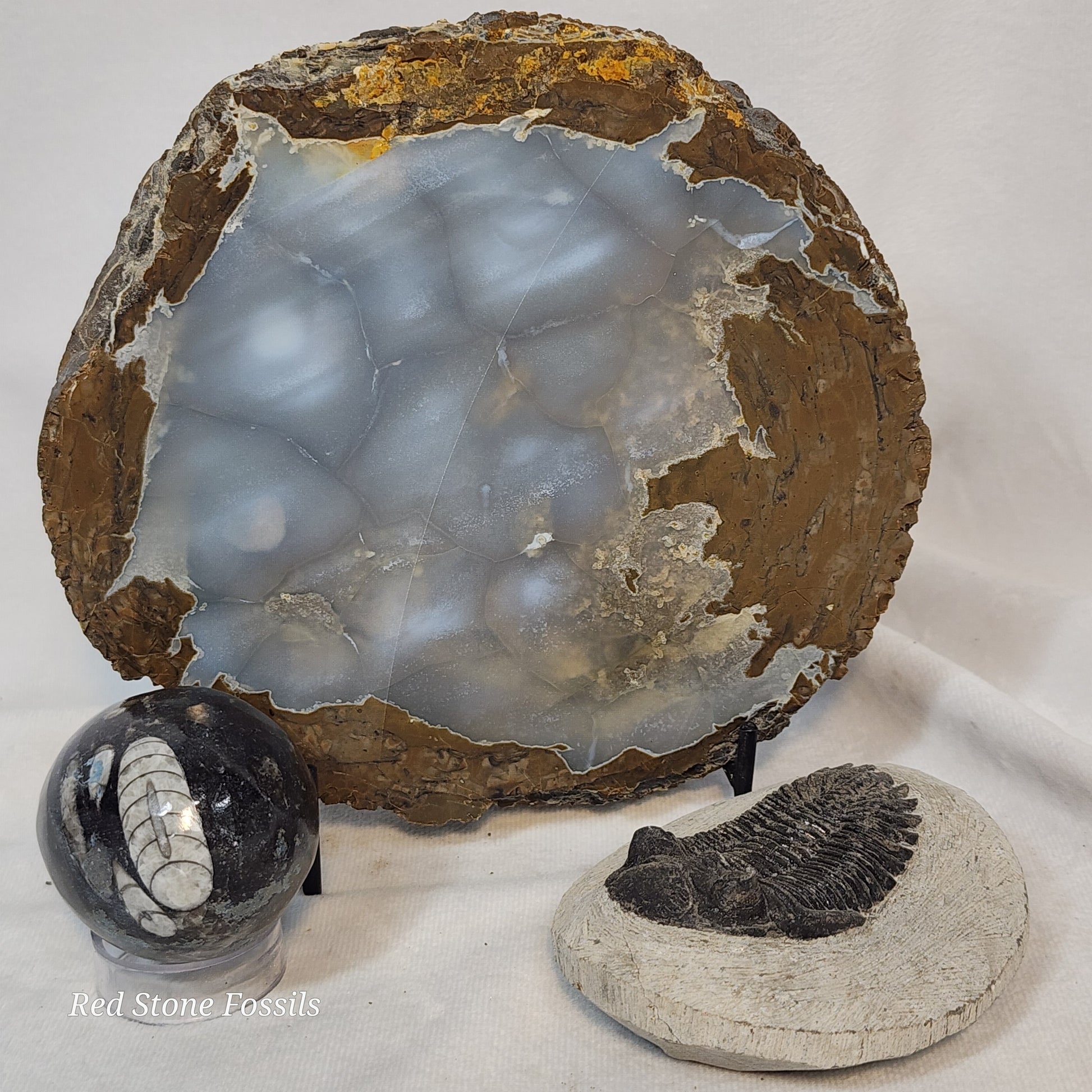 This particular specimen has been split and polished to show off the gorgeous minerals inside! The blue and white natural swirl of colors is just stunning! Thundereggs pair nicely with our Orthoceras Spheres and Trilobites!!