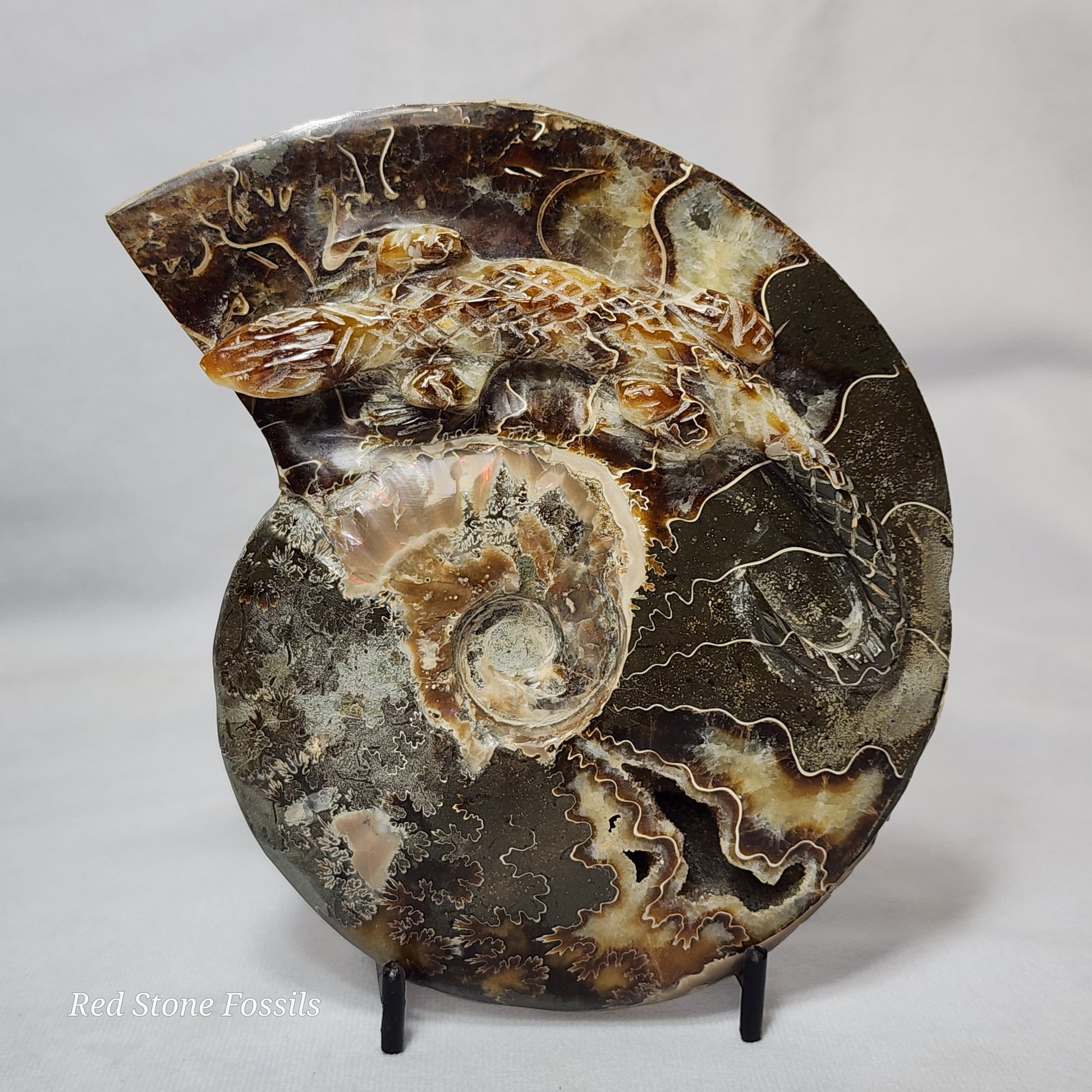 This specimen is unique and beautiful! It has a leaf-like suture pattern with a great blend of brown, caramel, and gray natural coloring and fabulous crystal cavities! The carved Lizard has splendid detail as well!
