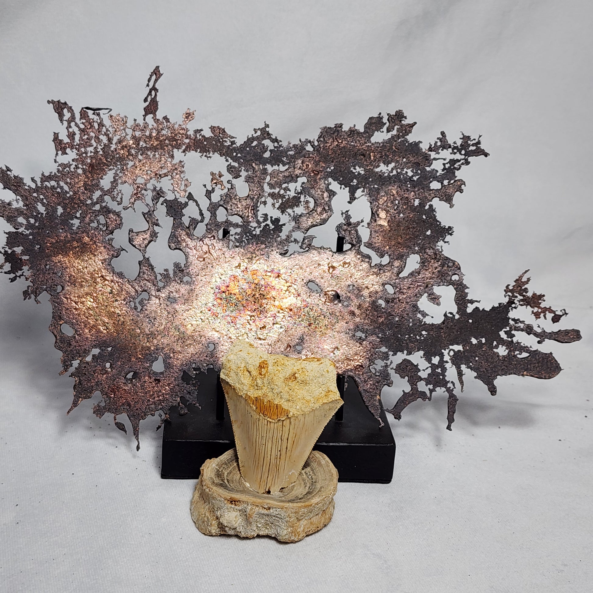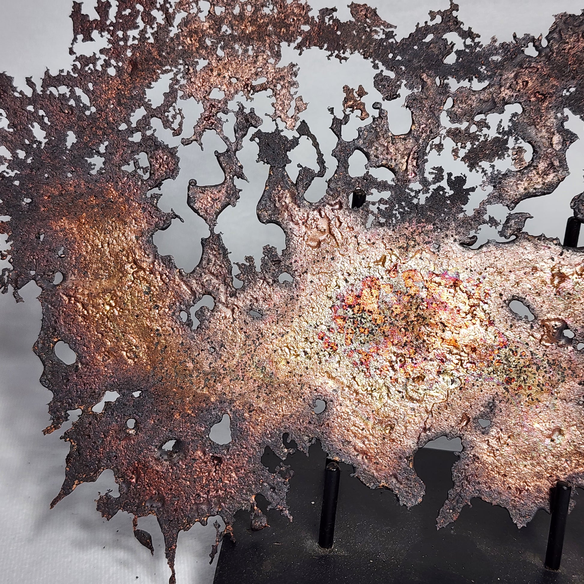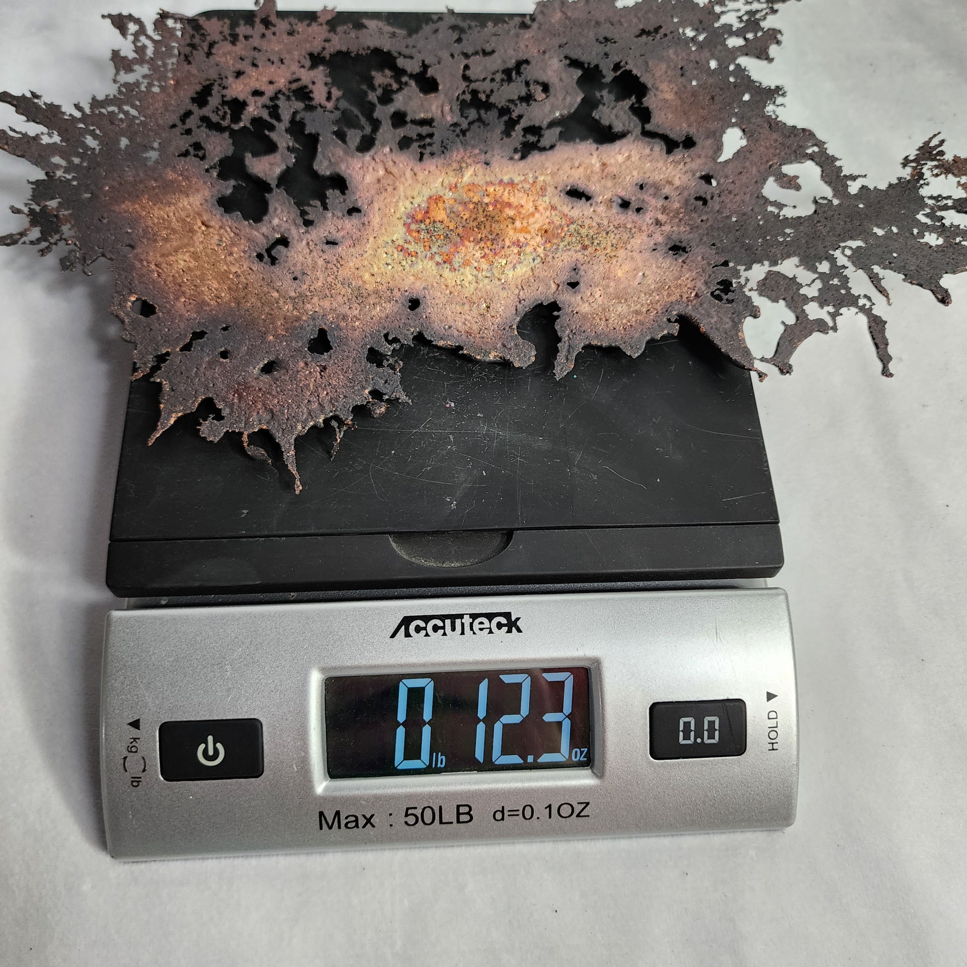 This Splash Copper is pure copper and a unique piece of art. The multi-color red, yellow, orange and brown natural coloring is just stunning to look at! The shape of this particular specimen is one of a kind!
