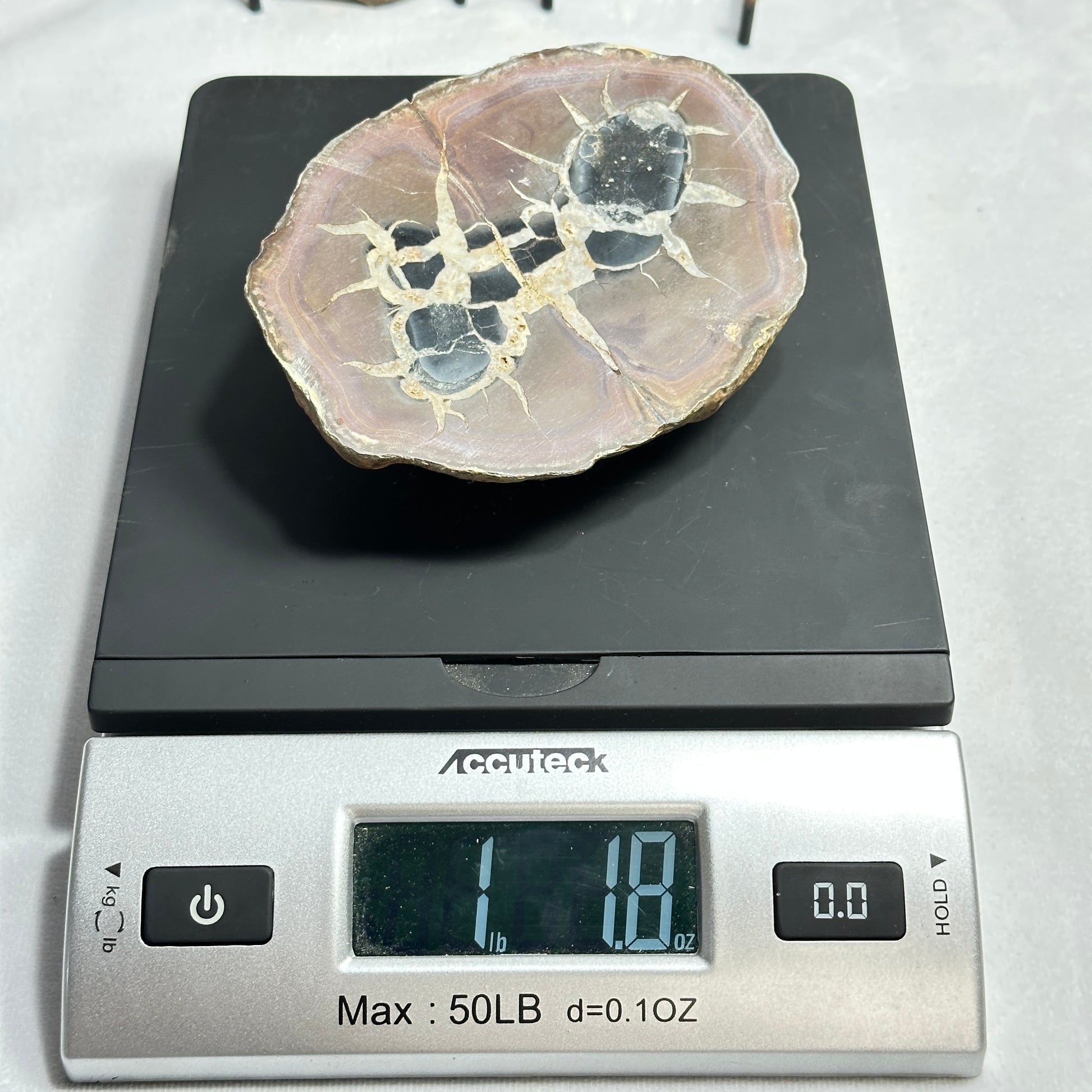 Split Polished Septarian Nodules make a very interesting display piece! Display them side by side for a great conversation starter! Pair with our Grape Agate, Ammonite, or even our Calcite for a gorgeous display!