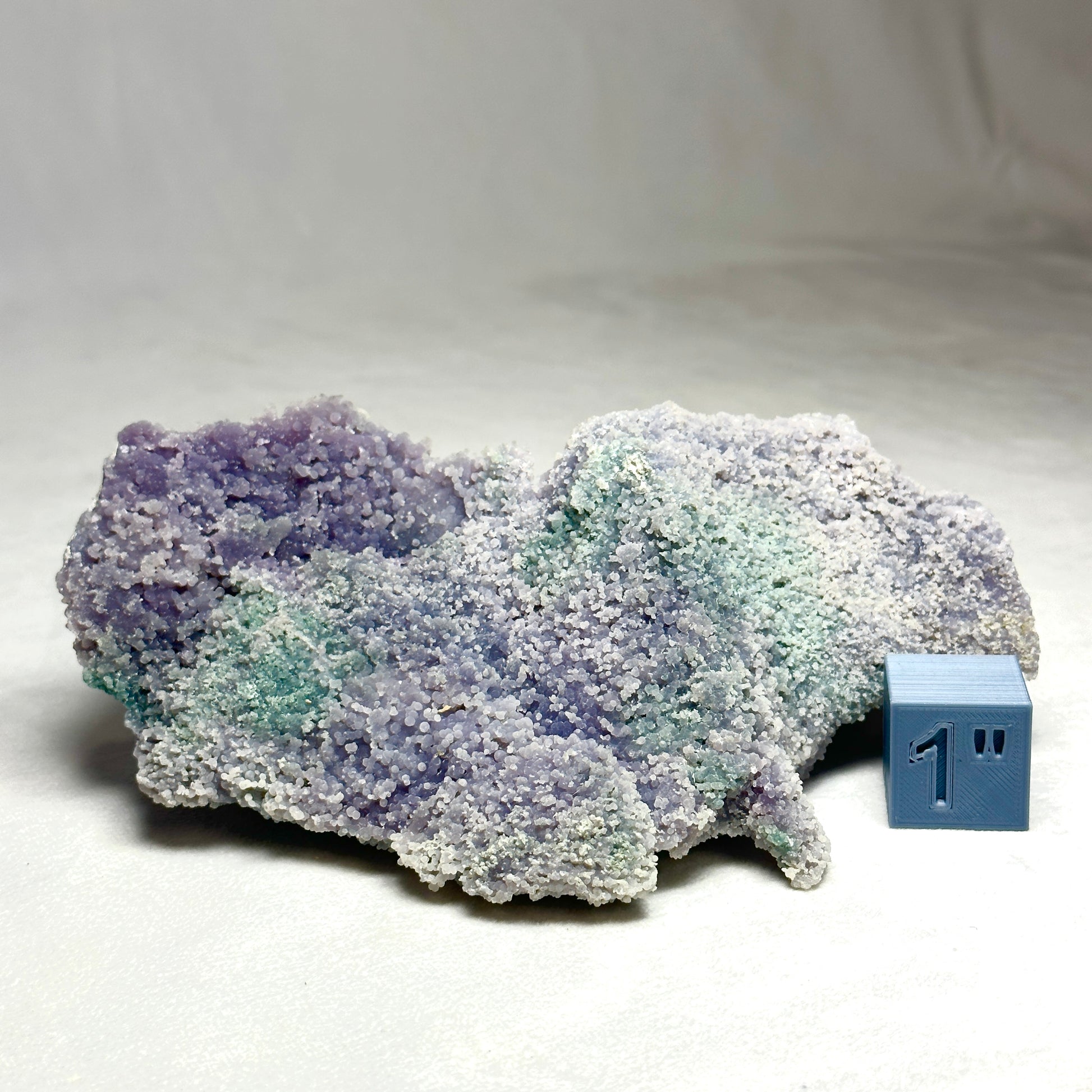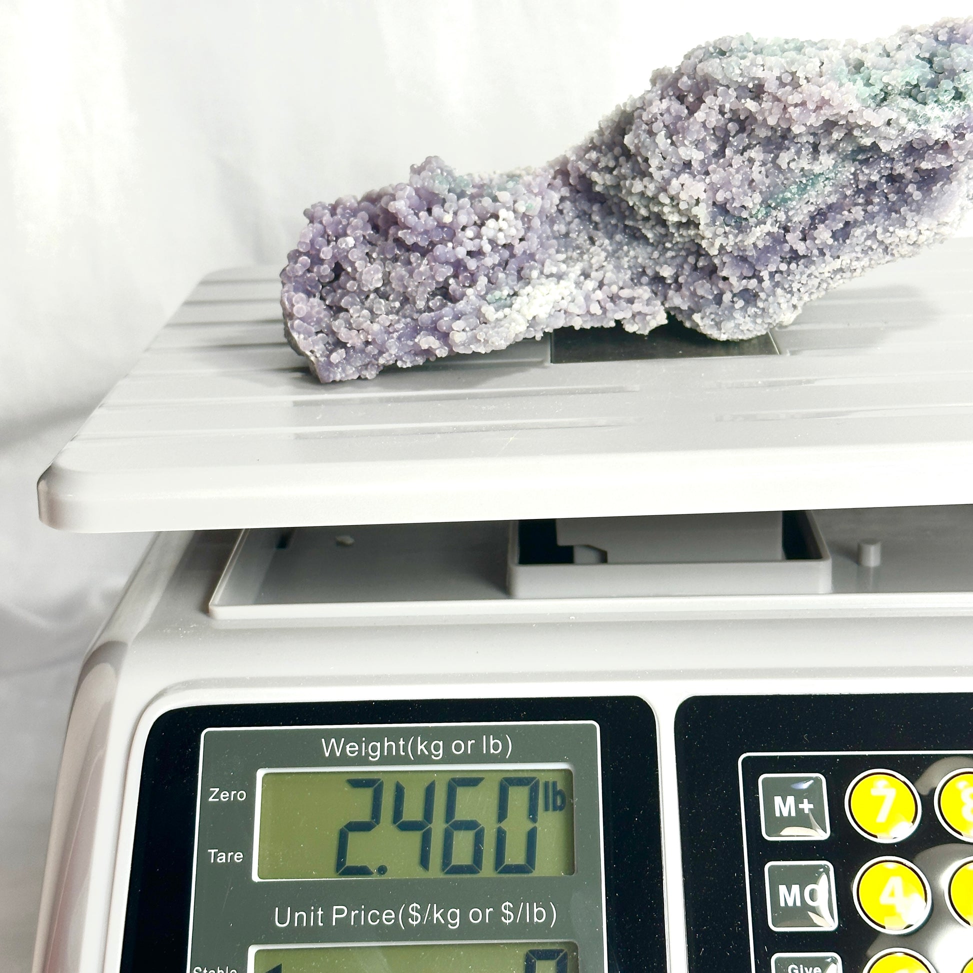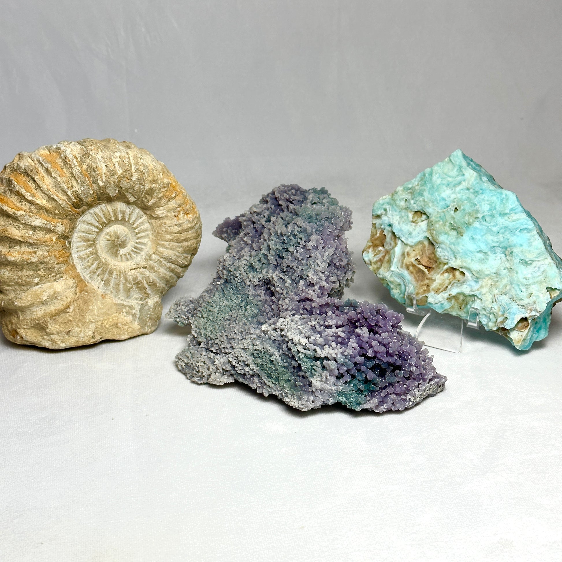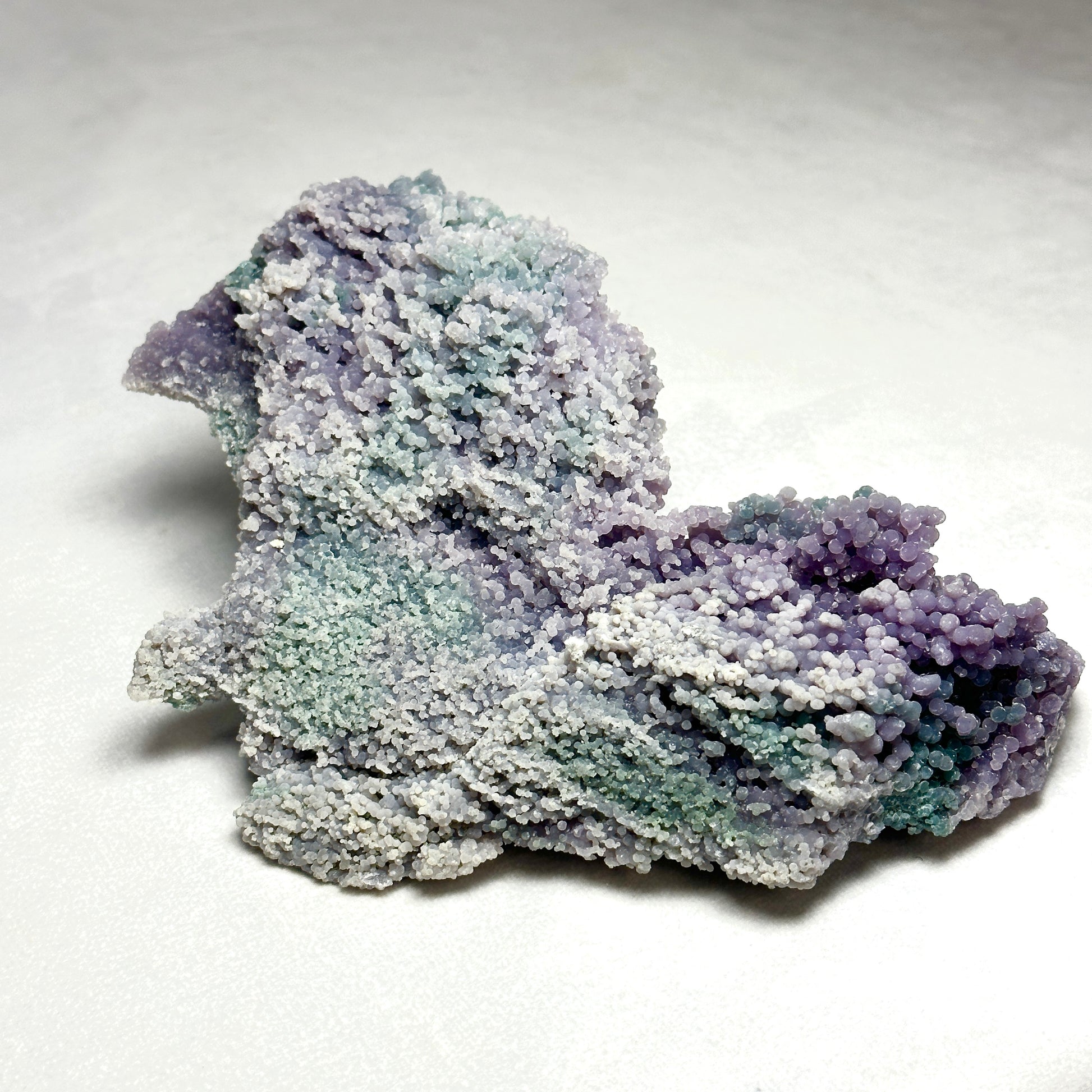 This Grape Agate is a beautiful natural mineral, with a gorgeous shades of purple and green has a unique shape as well. It harbors a special charm that adds a touch of sparkle to any room. Pair with our Ammonites or Blue Aragonite for that perfect shelf display!