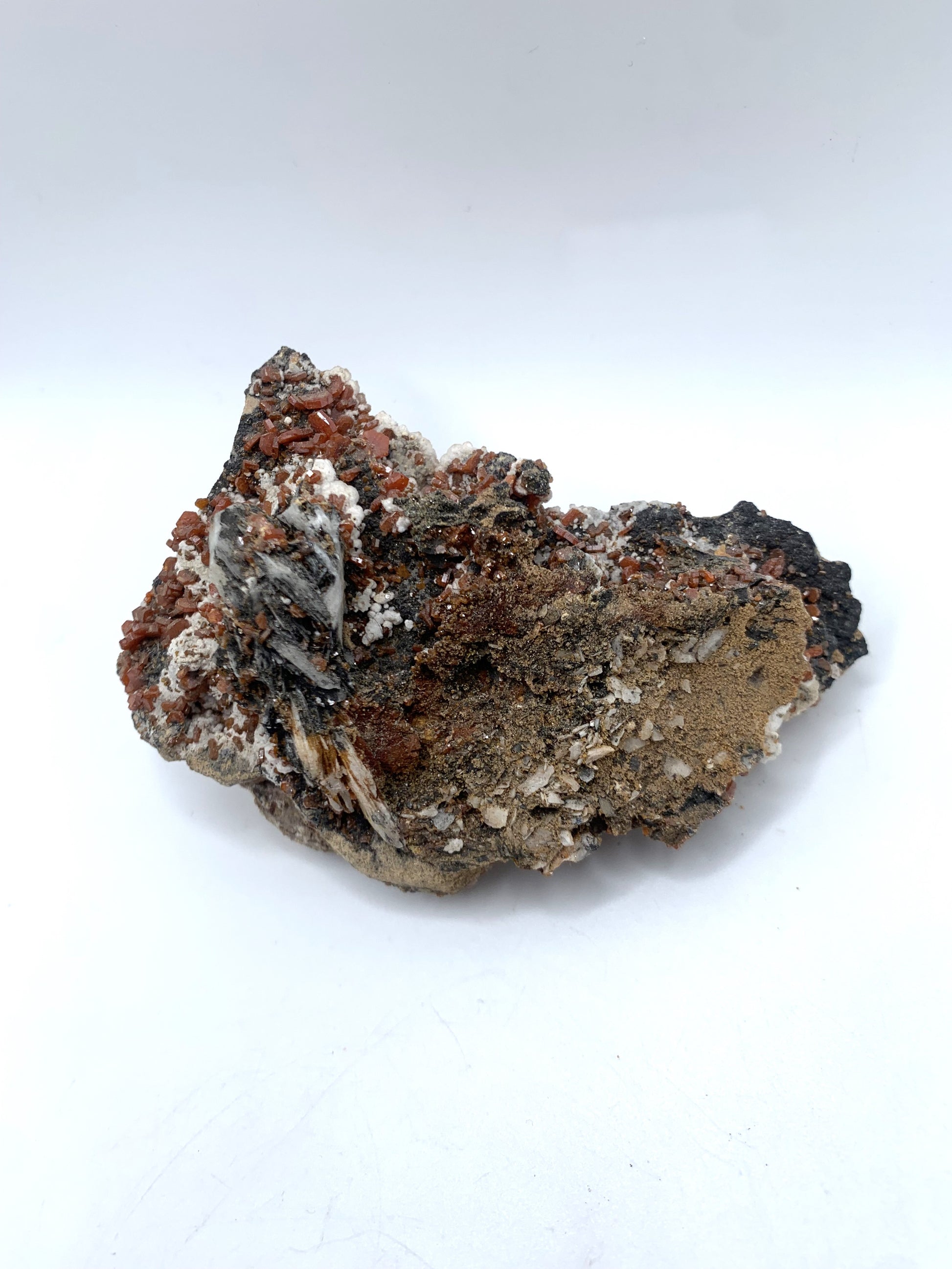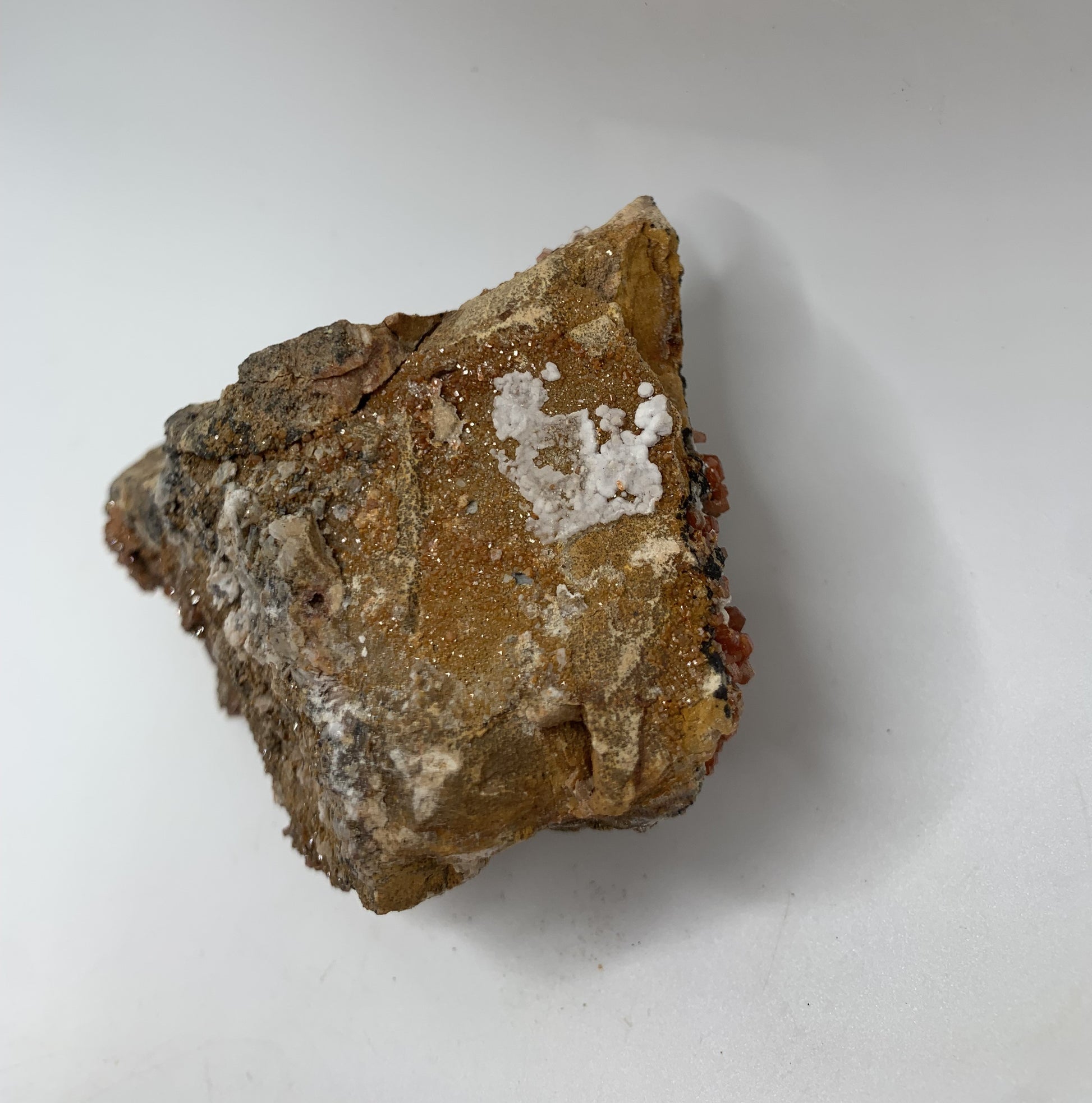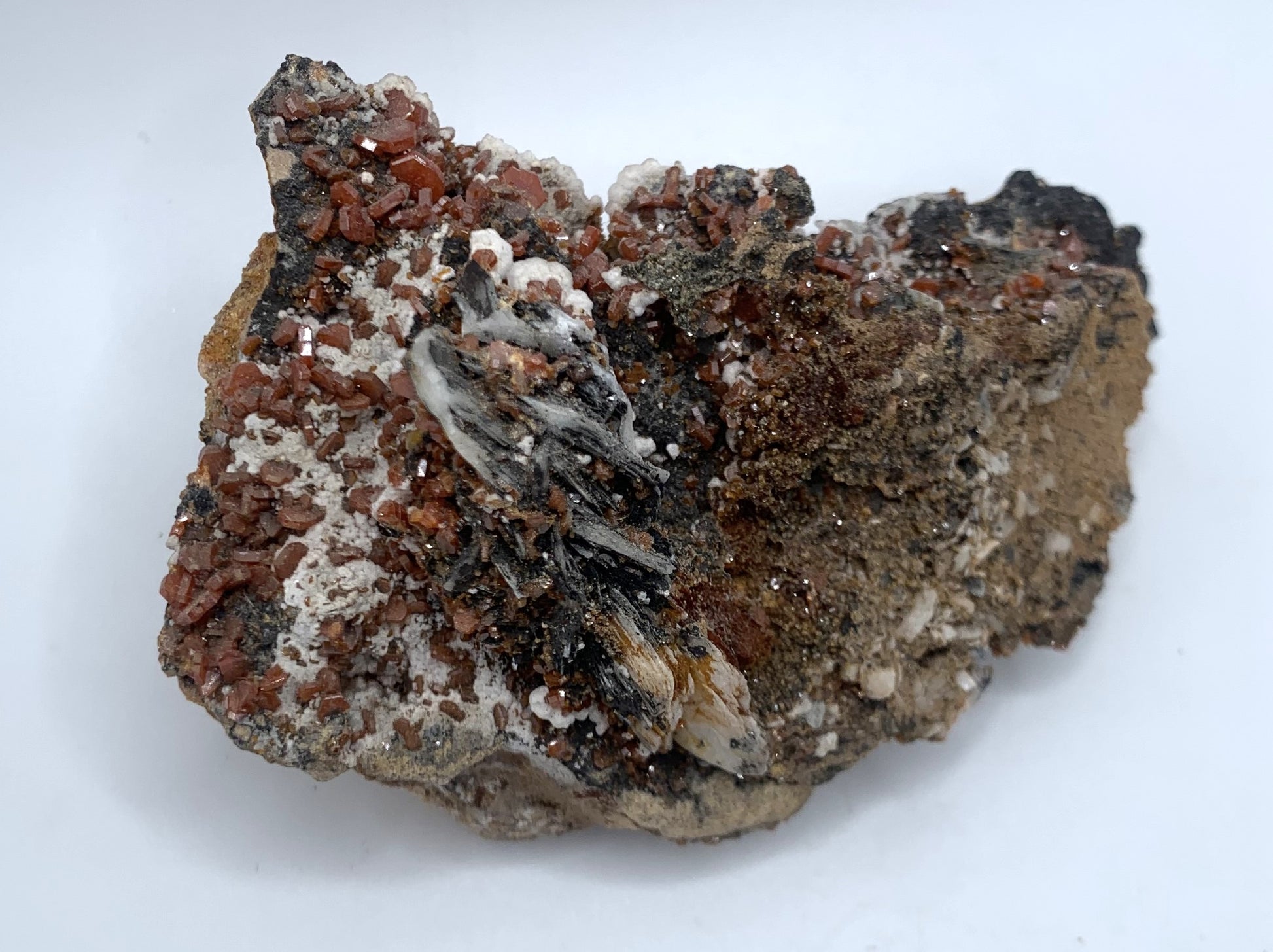 This fine rock is Vanadinite, a gorgeous red mineral from Morocco. These minerals are sought-after, and can reach prices up to thousands of dollars, even for a piece like this!