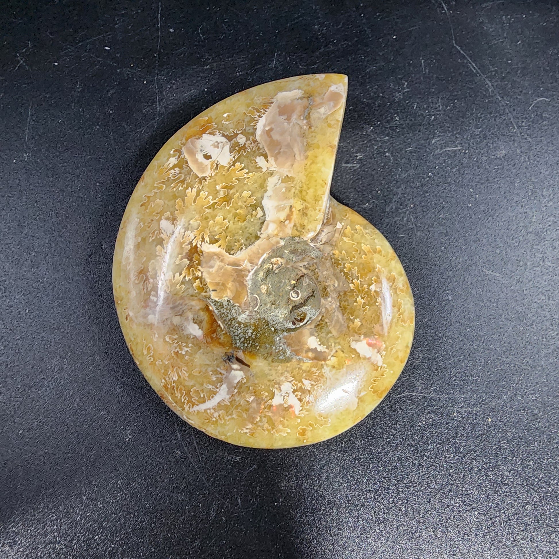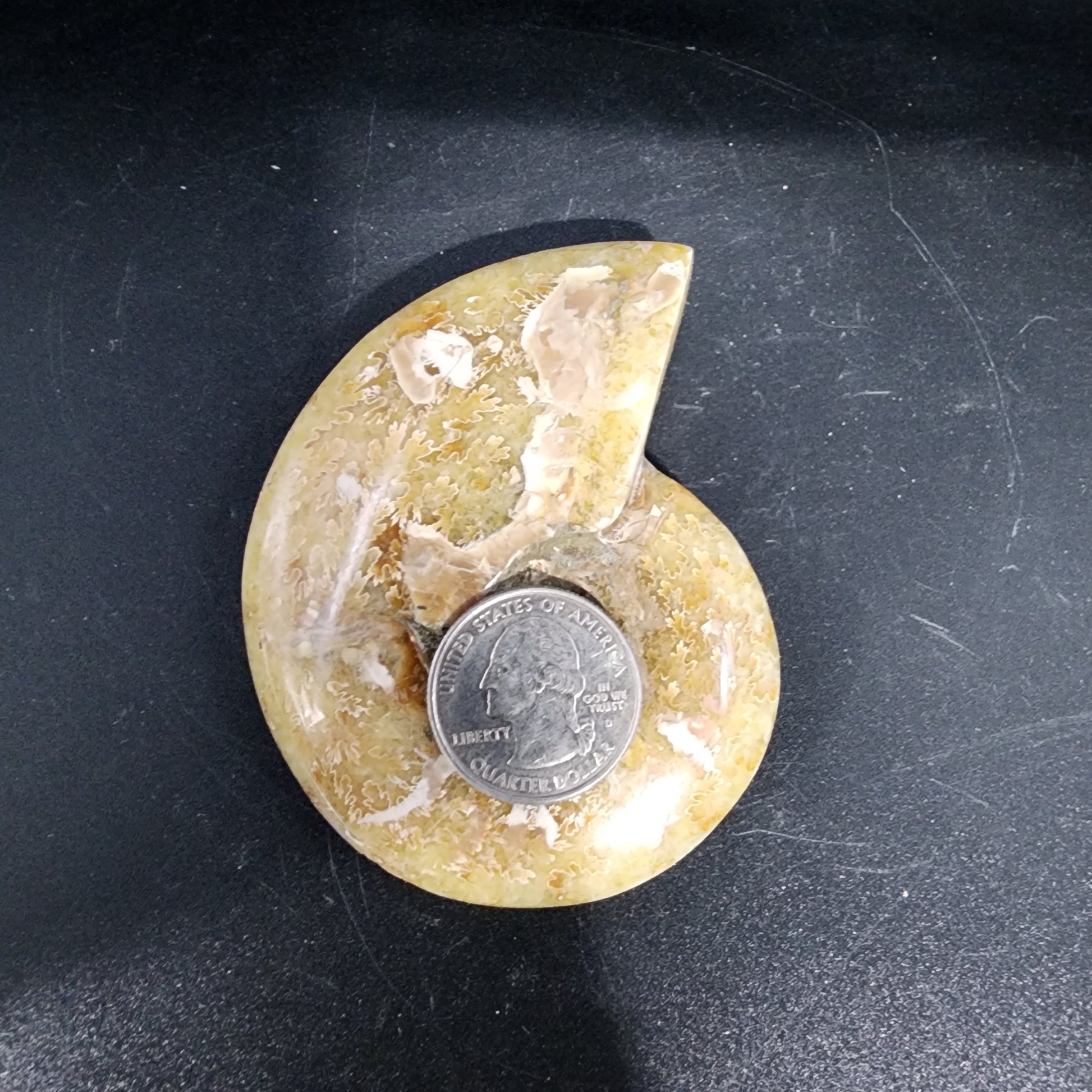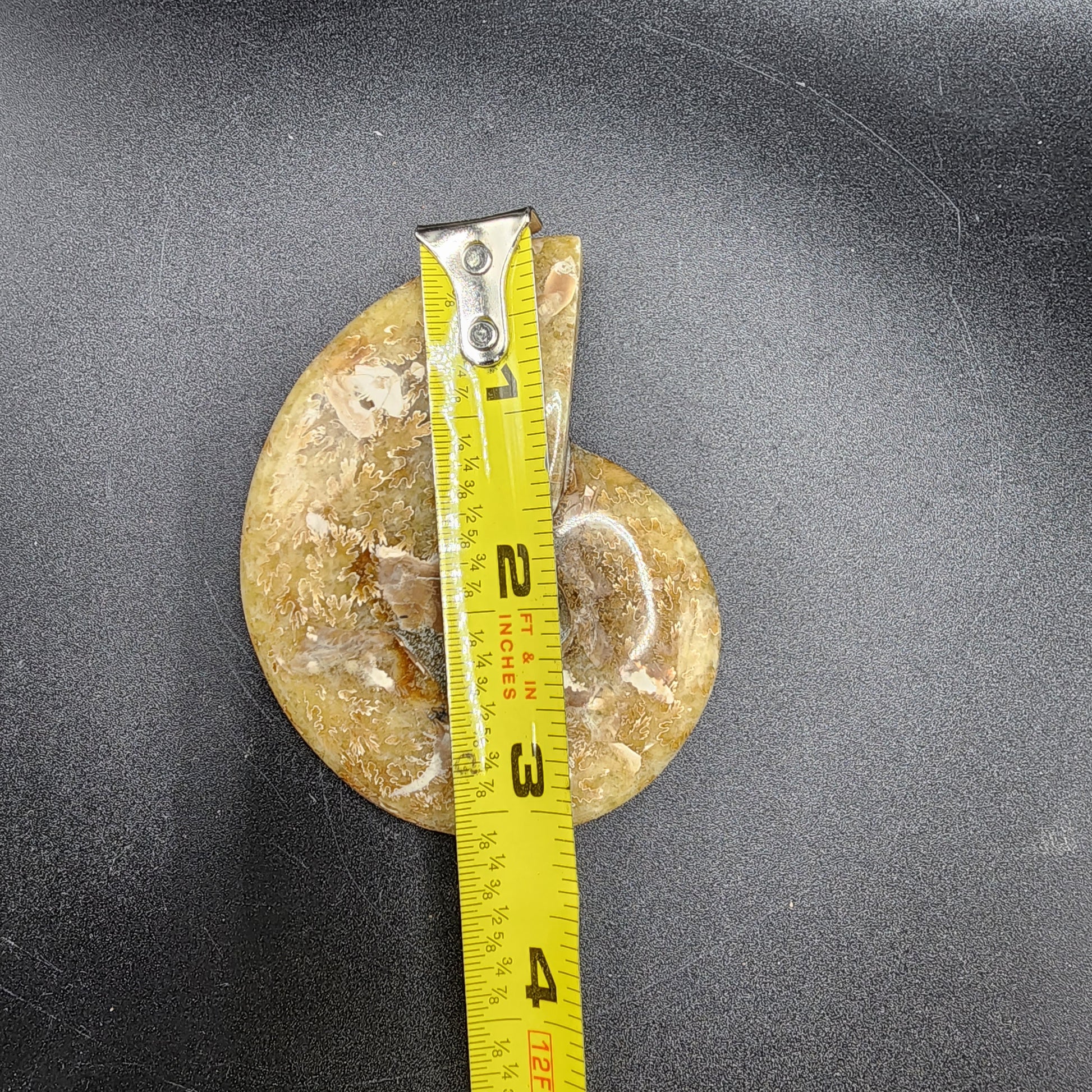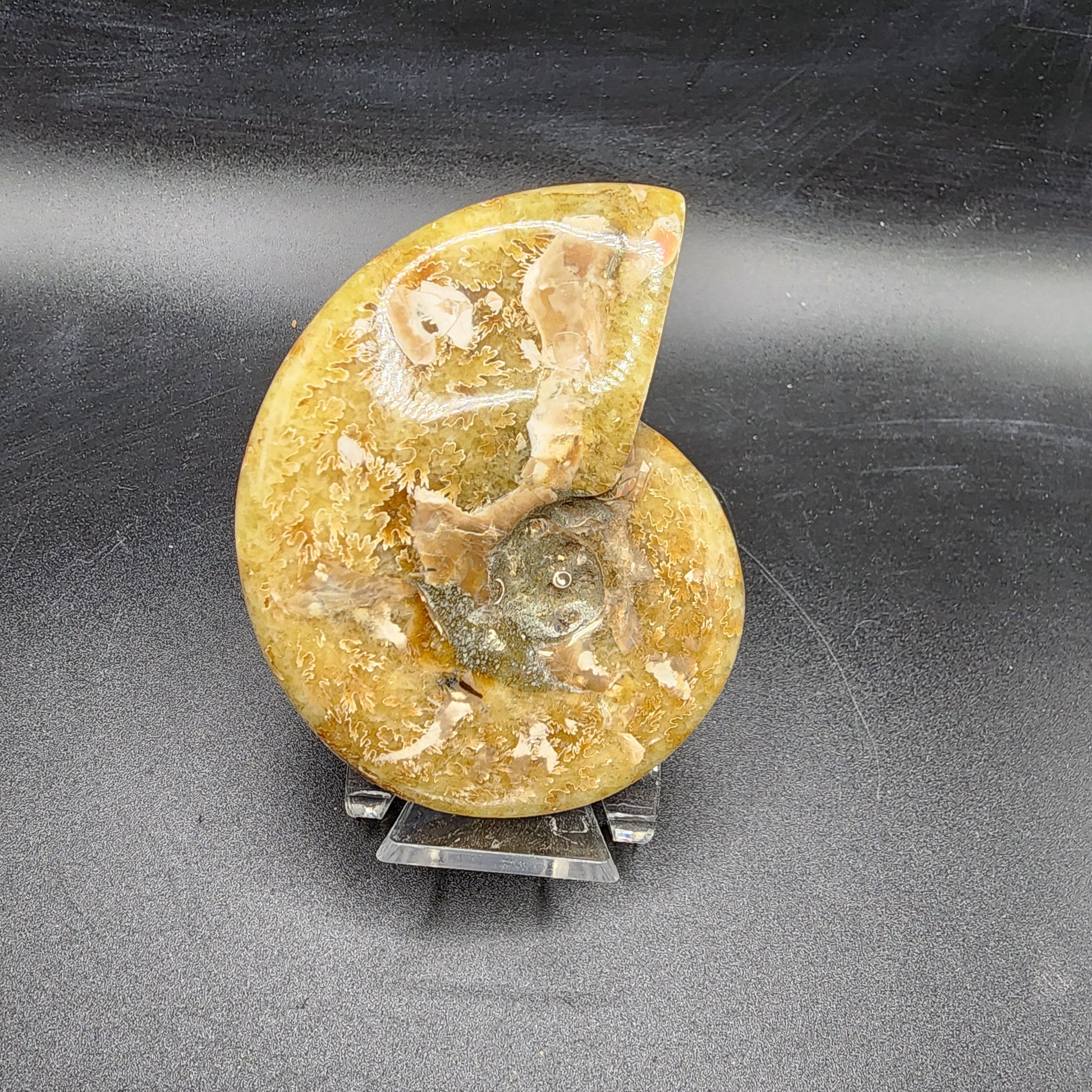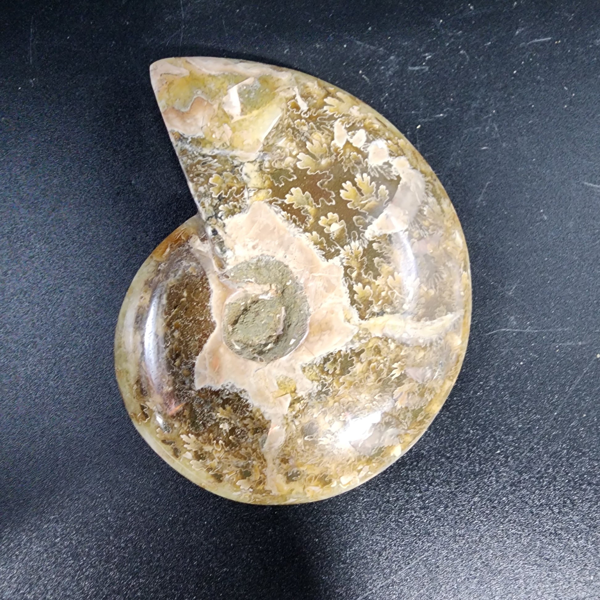 Look at the stunning shades of caramel brown and light brown around every curve of this ammonite.